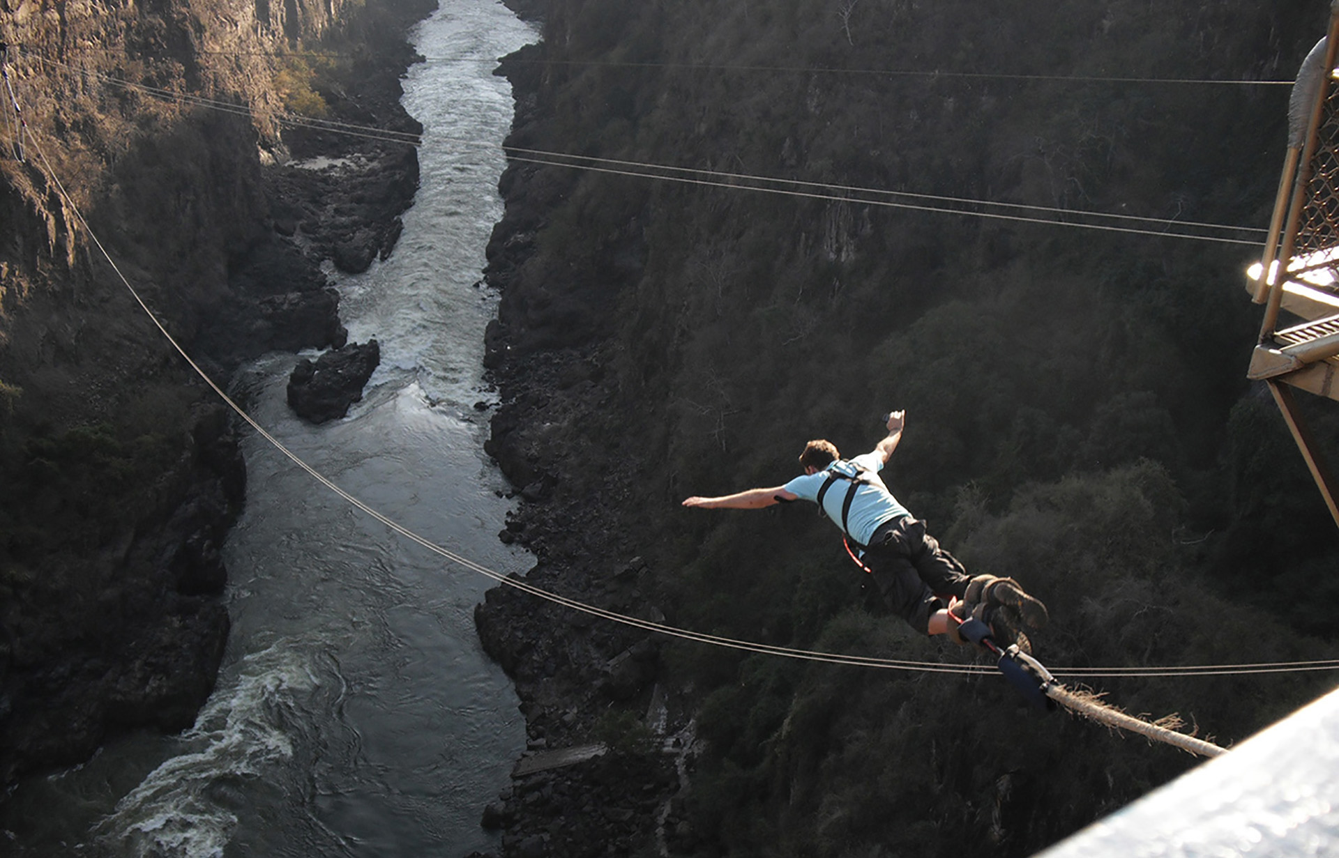 Få adrenalinet att pumpa med ett bungee-jump från den ikoniska Victoria Falls-bron som är 111 meter hög och förbinder Zimbabwe och Zambia. Bungee-jumping härifrån ger en utsikt över ett av de mest natursköna områdena i hela Afrika och samtidigt får du möjlighet att prova något som många har högst upp på sin bucket-list. De professionella arrangörerna instruerar dig naturligtvis i processen och ser till att skapa ramarna för en oförglömlig upplevelse. Vågar du att utmana dina gränser och hoppa ut? Om inte, kan du fortfarande vara lugn. För de mer försiktiga kan en tur med linbana över ravinen rekommenderas som ett alternativ. På flera ställen i området finns det kraftiga stålrep spända över ravinen, där den längsta glidturen är hela 425 meter. Här kan du i en mer bekväm takt njuta av den fantastiska utsikten med Zambezifloden som rinner under dig.