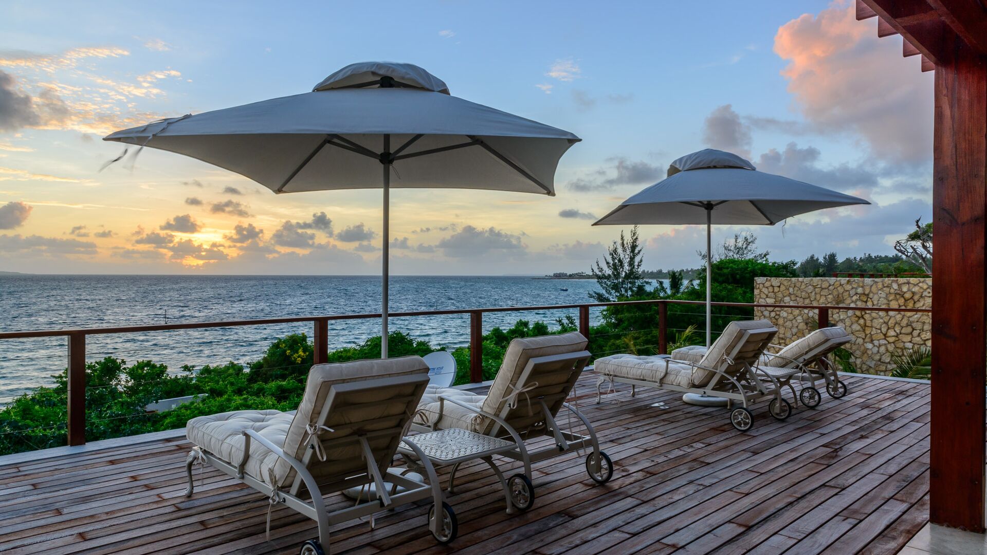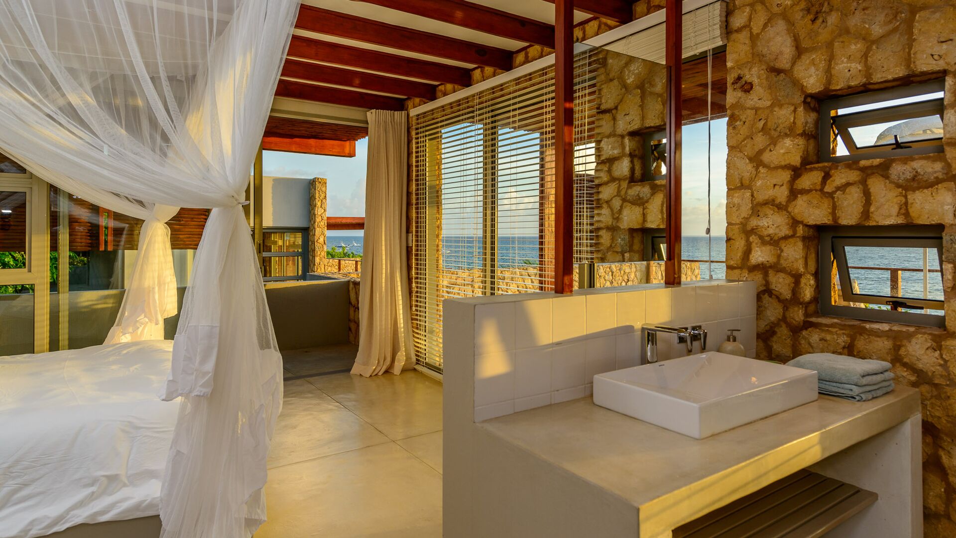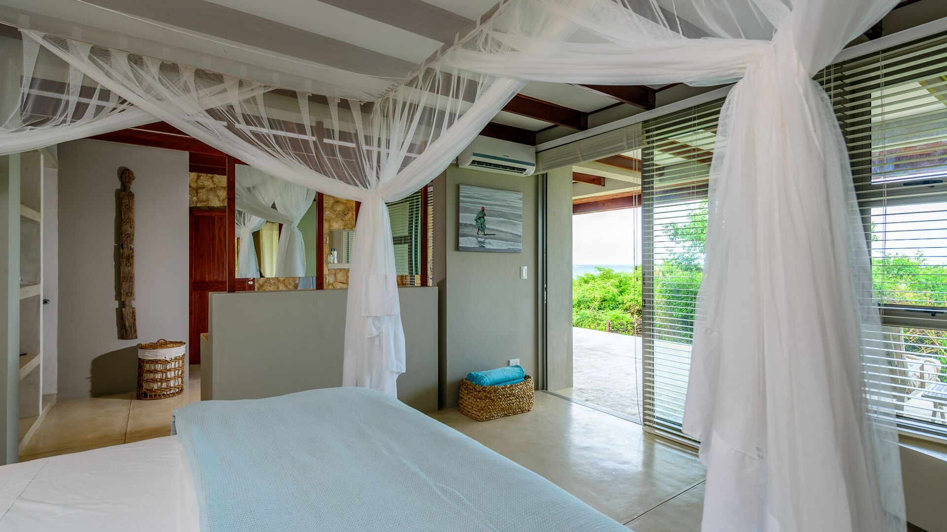 Stort dejligt værelse med ”queen size” seng, badeværelse med toilet og bruser, samt stor veranda med solsenge og en fantastisk havudsigt.