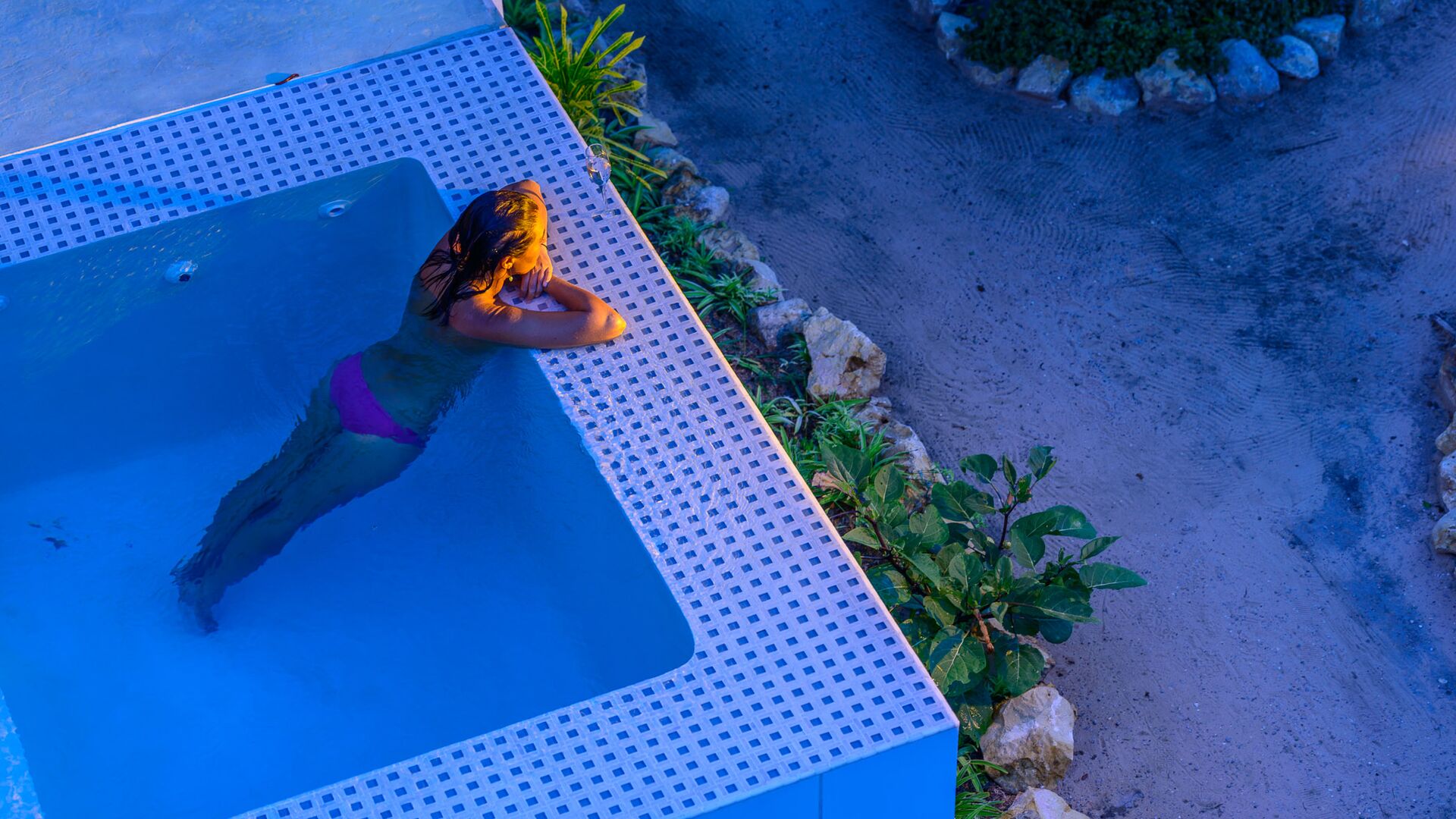 Denne er en hel lille lejlighed med “king size” seng, opholds lounge med TV, stort og rummeligt badeværelse, veludstyret kitchenette, terrasse med solsenge, grill og en lille privat pool. Er også perfekt til en familie med et eller to børn