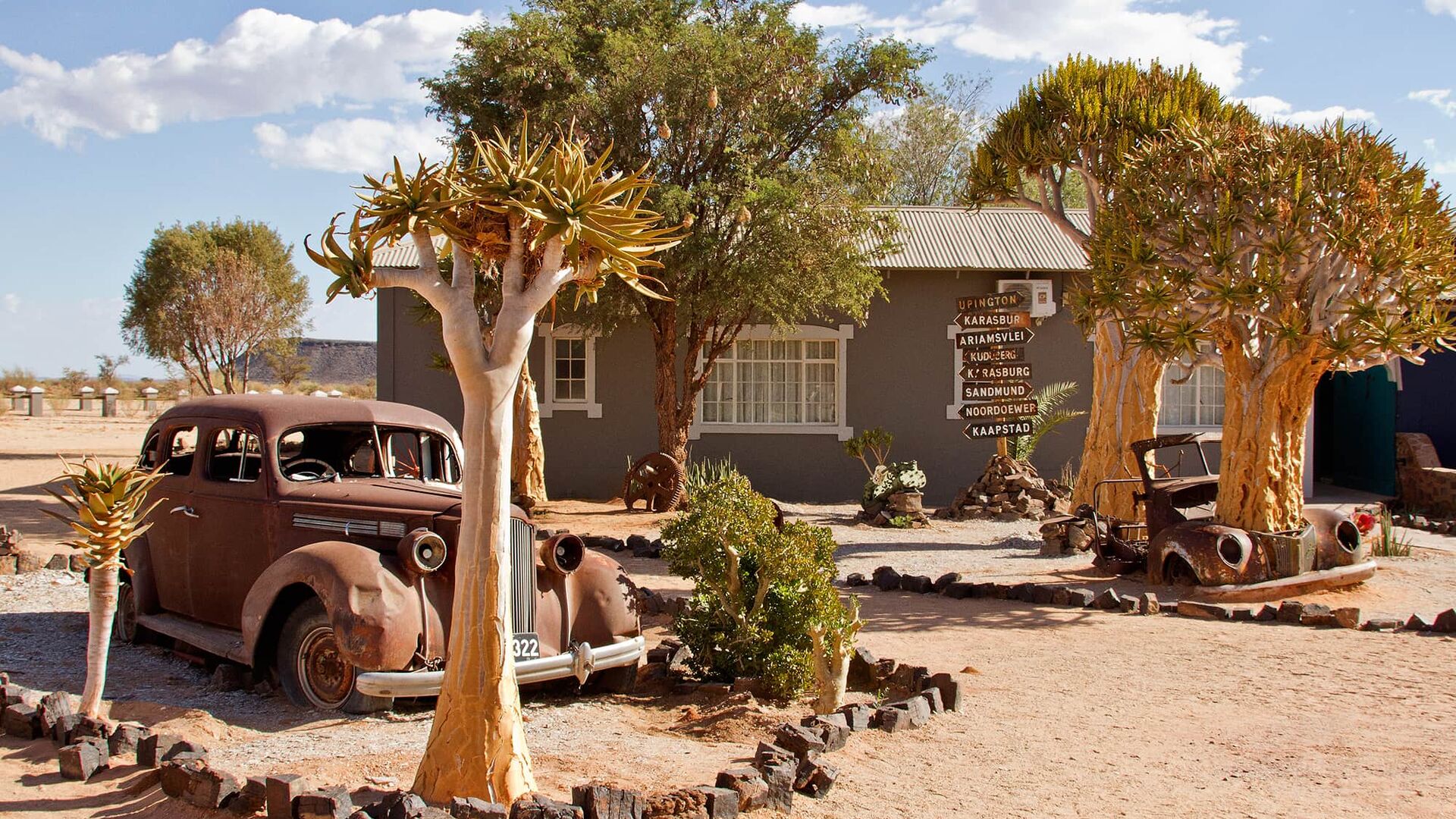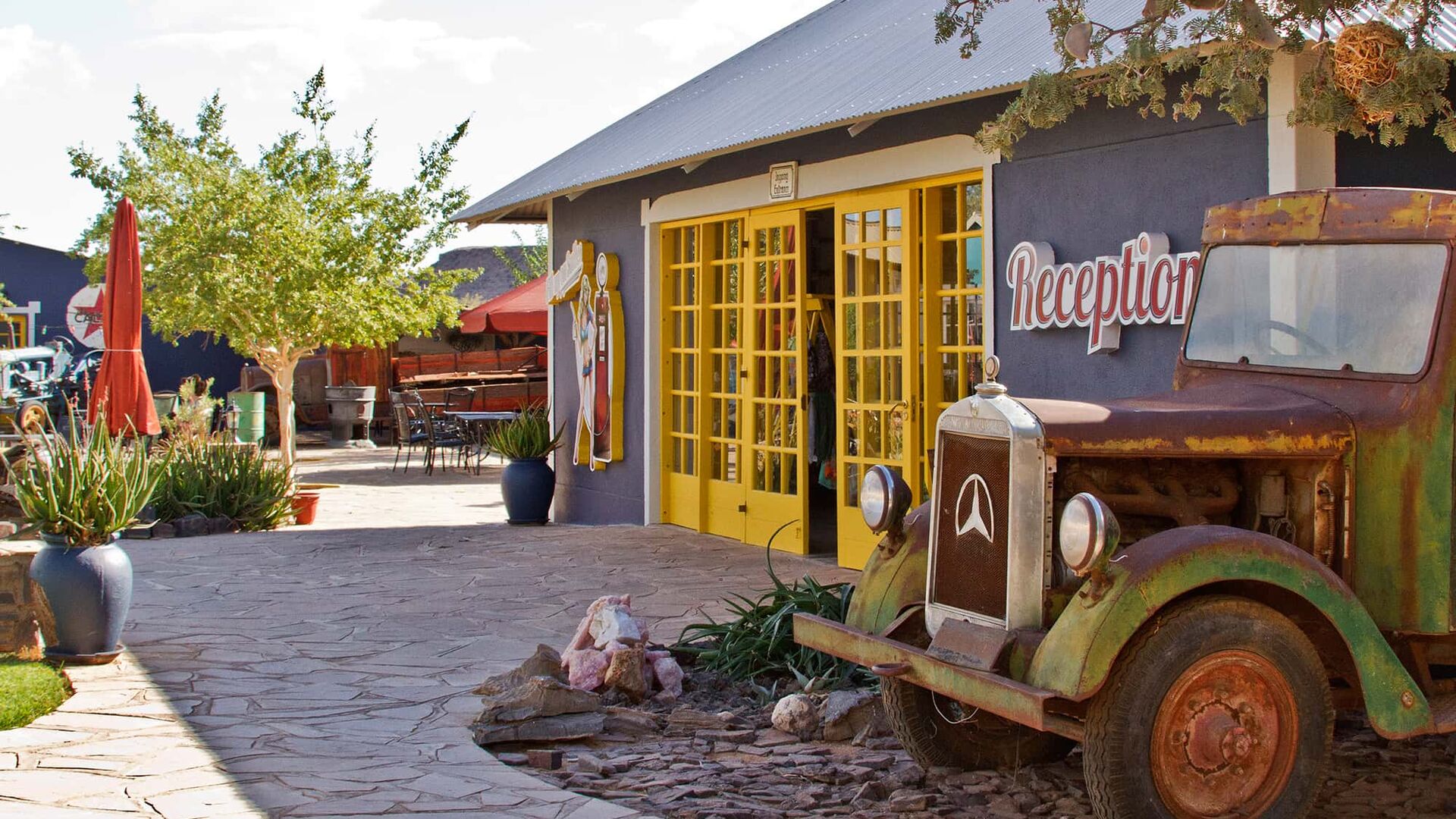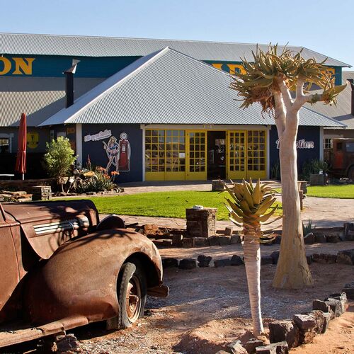Nyd et unikt og charmerende ophold på denne usædvanlige lodge, der ligner en gammel vejcafé. Lodge'en er som en skattekiste fyldt med sjæl og charme, og et absolut 'must-visit' stop. Det udvendige område afspejler den eventyrlige atmosfære indenfor med sine antikke Chevys og Fords fra en svunden æra, omgivet af smukke quiver-træer og ørkenens flora. Parkér bilen og træd indenfor.
