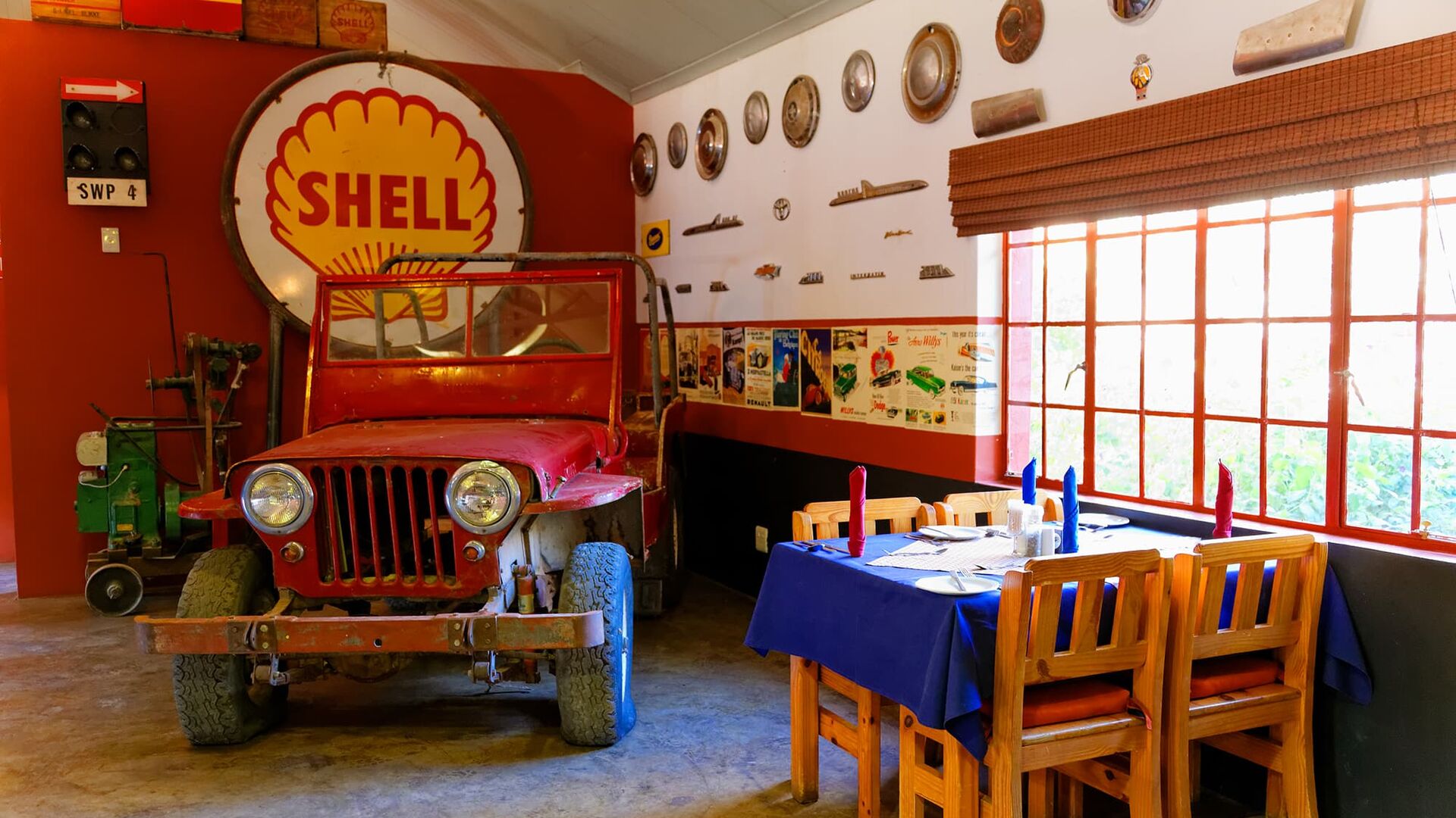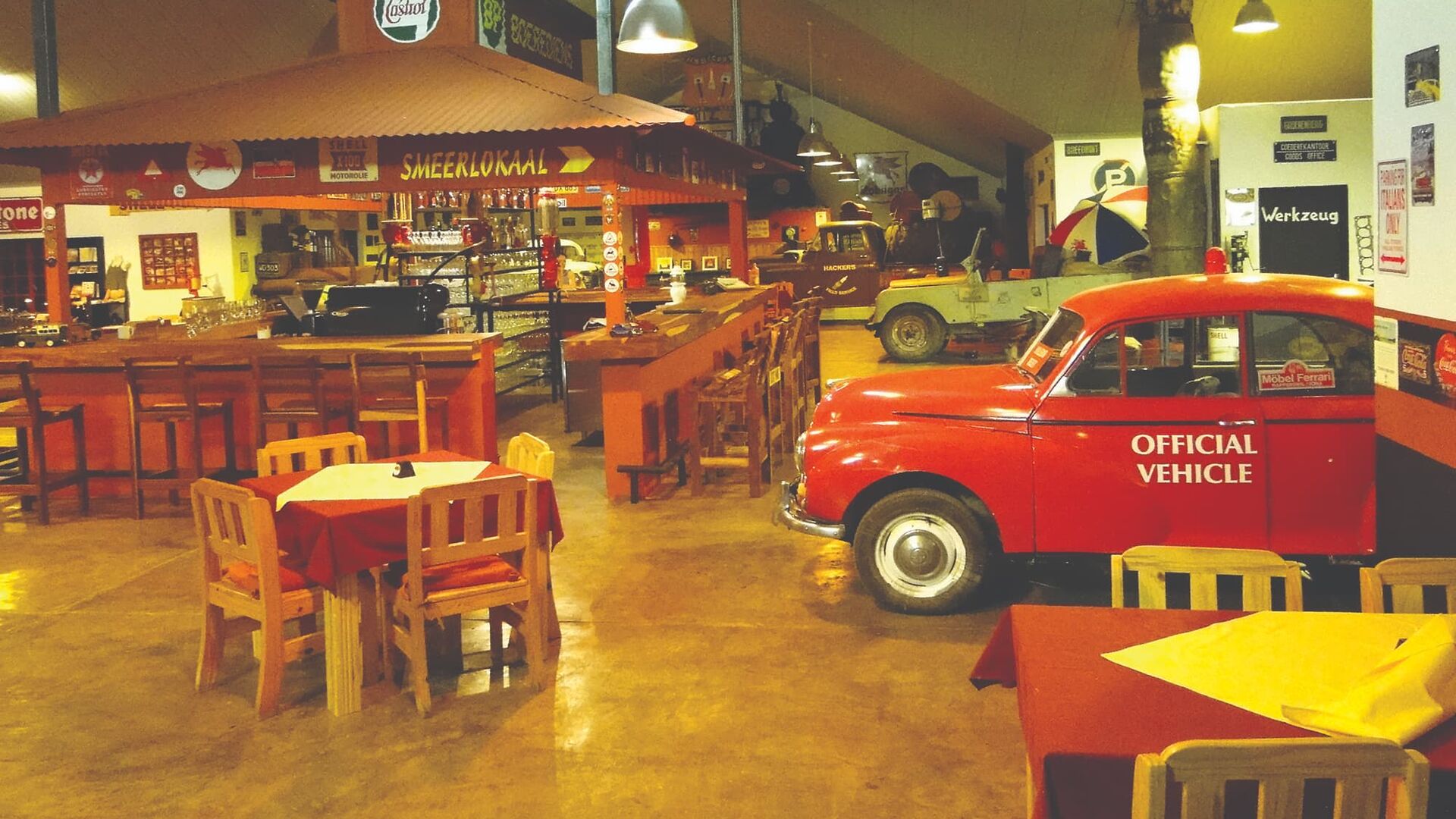 Når de store døre åbnes, vil besøgende føle, at de træder ind i en skatkiste af spændende overraskelser. Her mødes de af en receptionsskranke, der er omdannet til en gammel International lastbil, en bar inspireret af en benzinstation ('pompstasie'), og en samling af klassiske køretøjer og transportrekvisitter, som er sammensat med en kreativ og humoristisk flair. Restaurantbordene er placeret mellem disse unikke indretningselementer, og i de kølige vintermåneder giver de originale bilkabiner en skæv og hyggelig atmosfære som pejse.