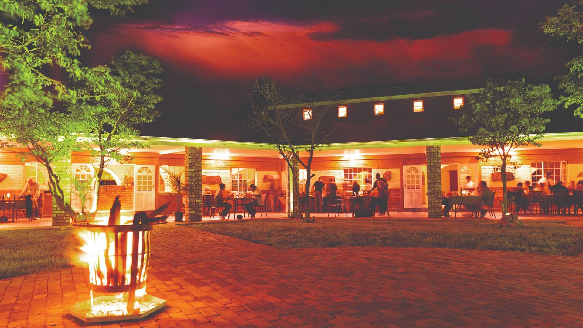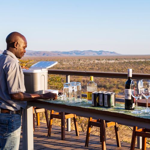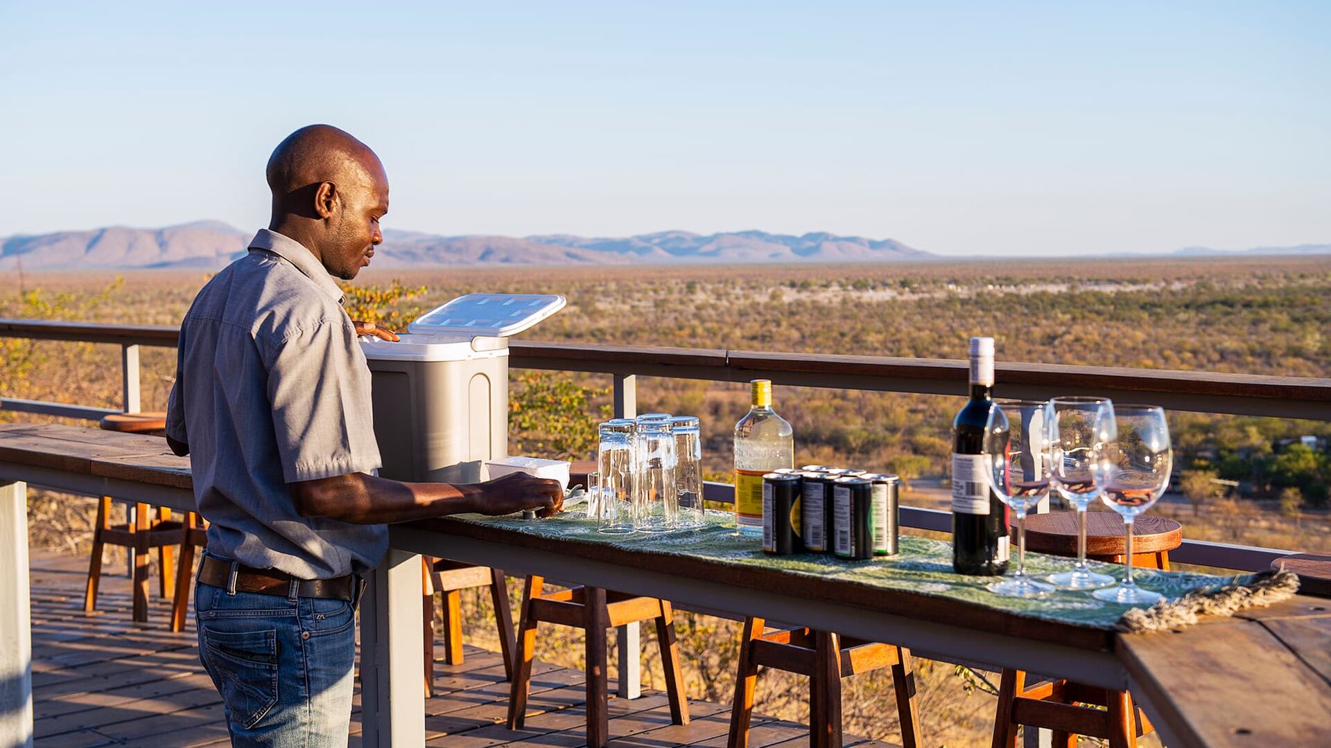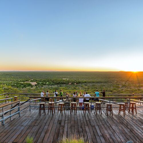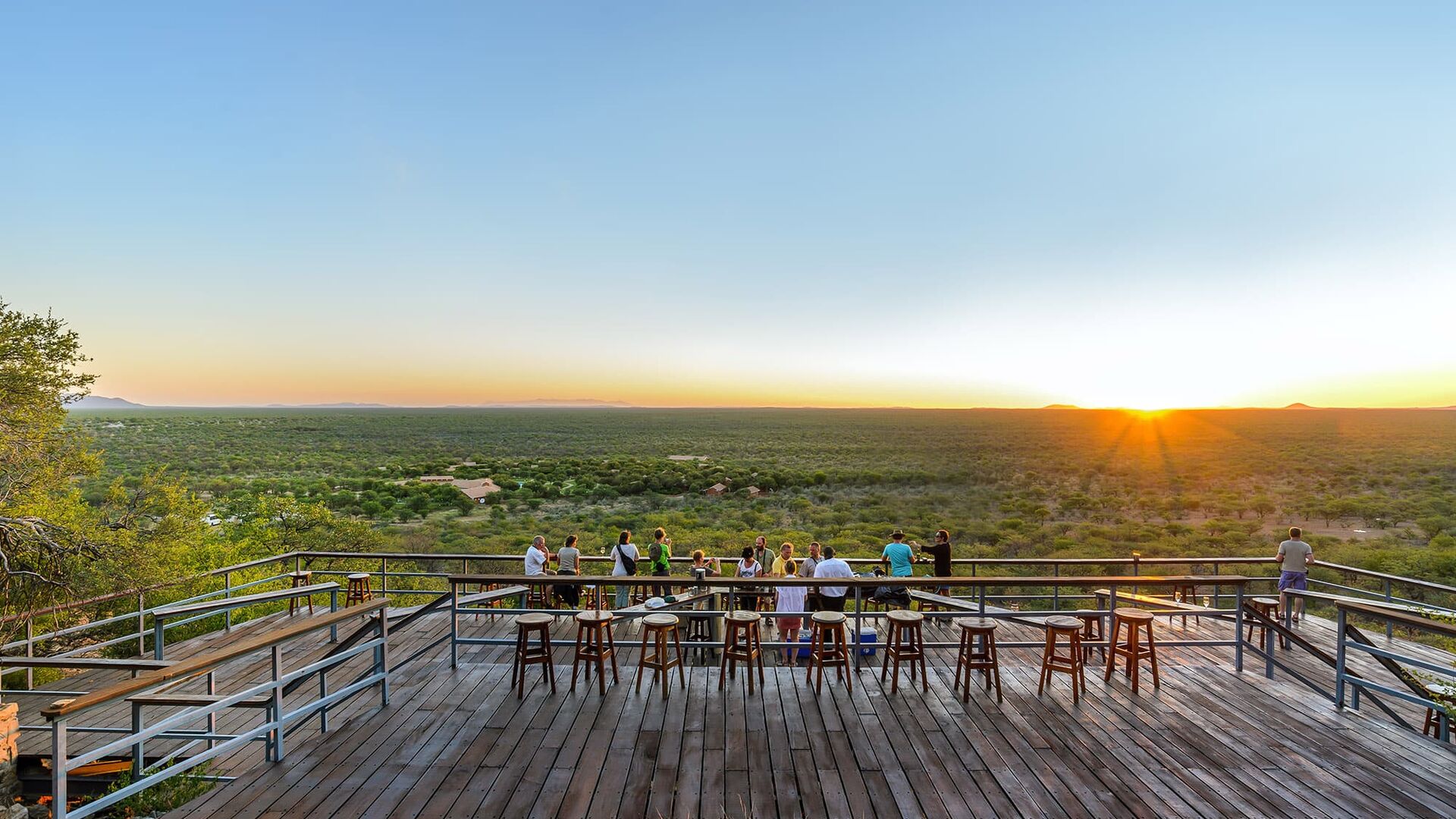 Et højdepunkt på dagen er at bestige bakken til et udsigtspunkt for at nyde en storslået udsigt over mopane skoven oplyst af solnedgangen. Dette er også det bedste sted at nyde en solnedgangsdrink og få et overblik over den fascinerende konstruktion af lodgen. Når dagen bliver mørk, er det tid til at vende tilbage til restauranten, hvor en hyggelig ild brænder i en pejs, og en lækker middag venter, serveret med et fint udvalg af friske grøntsager og urter.