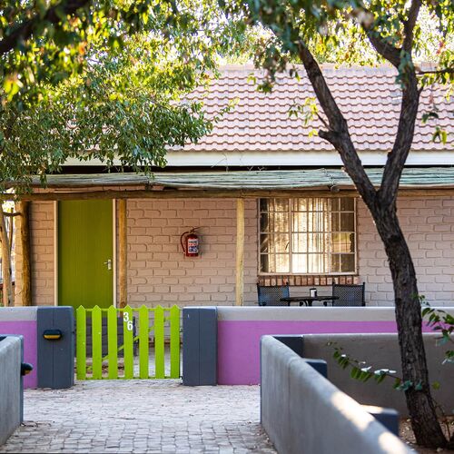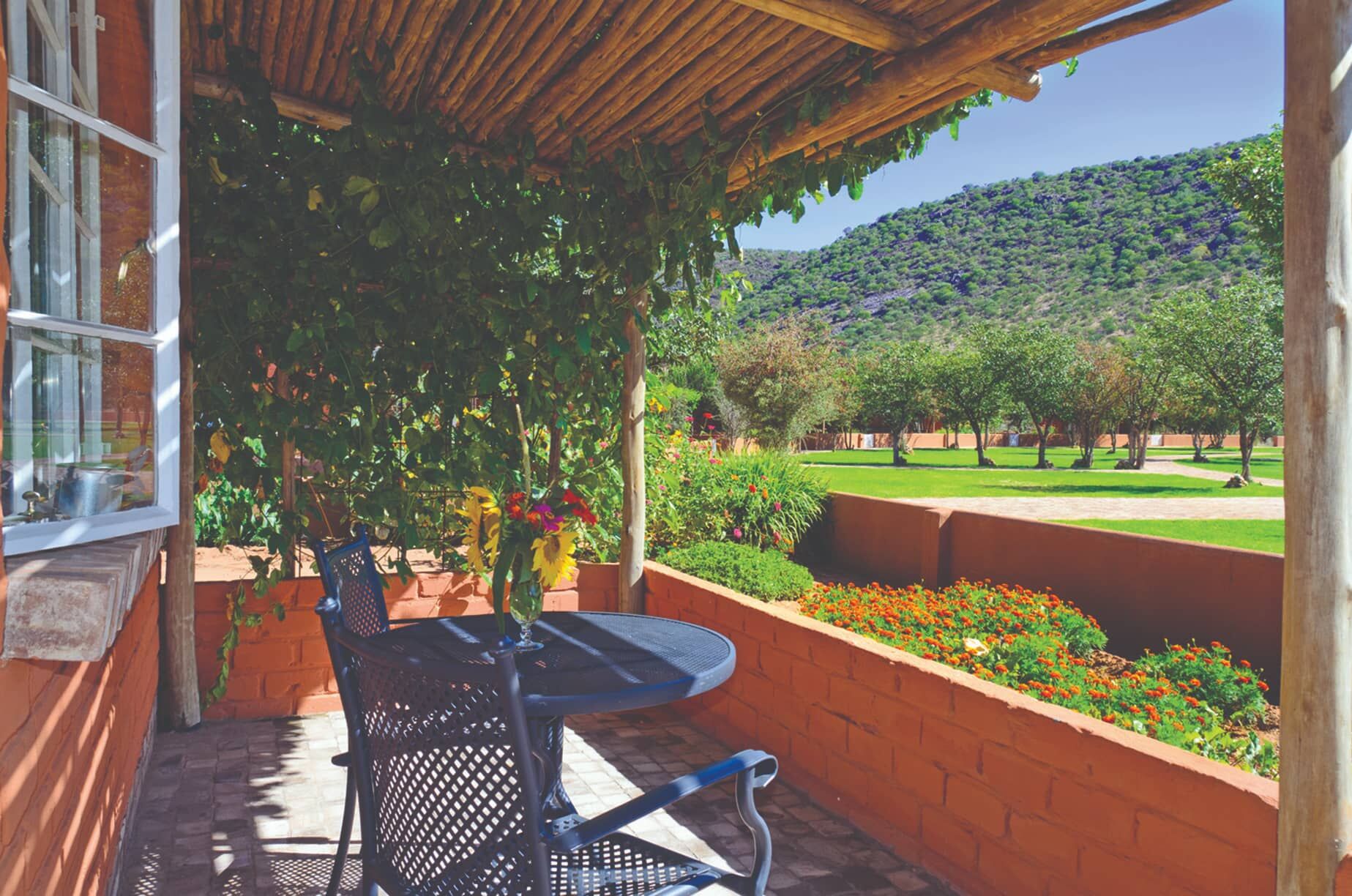Damara Mopane Lodge fremstår som en arkitektonisk perle, der minder om en fortidig afrikansk kongerige, placeret i en halvcirkel af sammenkædede stier, der fører til en overdådig swimmingpool i midten. Hvert chalet er innovativt designet med sin egen lille have, hvor grøntsager som sprudlende solsikker, spinat, rødbeder og skæve fugleskræmsler skaber en fortryllende atmosfære. Lodgeområdet byder på et labyrintisk netværk af stier, der leder til et stort og lyst fællesområde, hvor frisk grønt og hjerteformede mopane blade pryder interiøret.