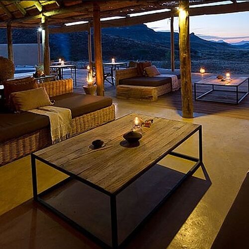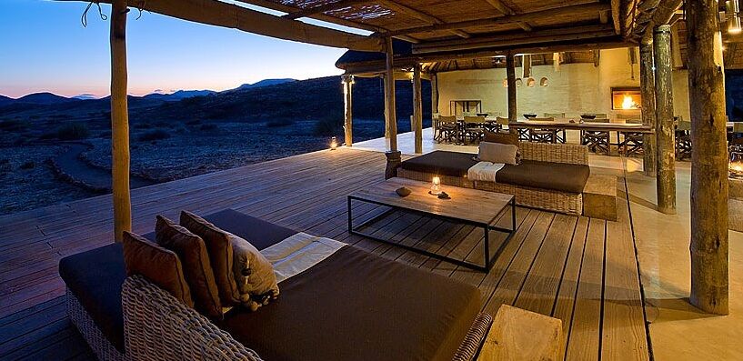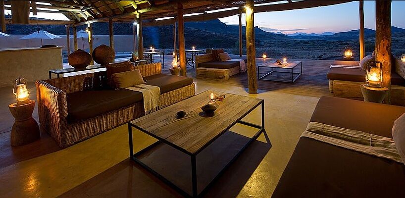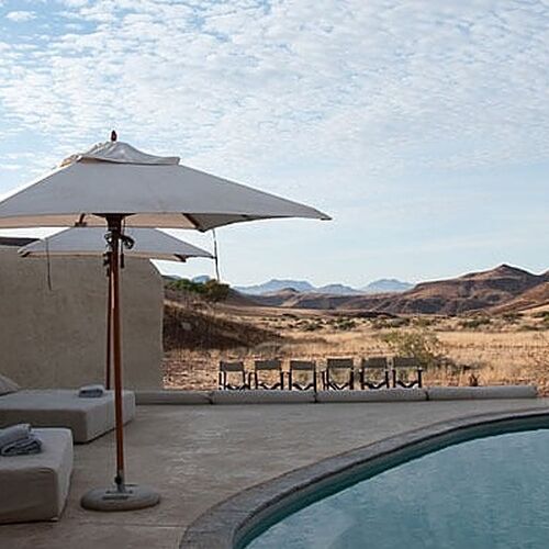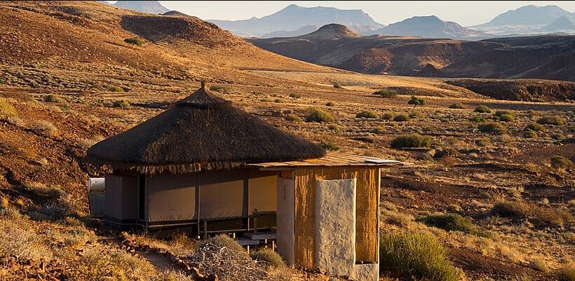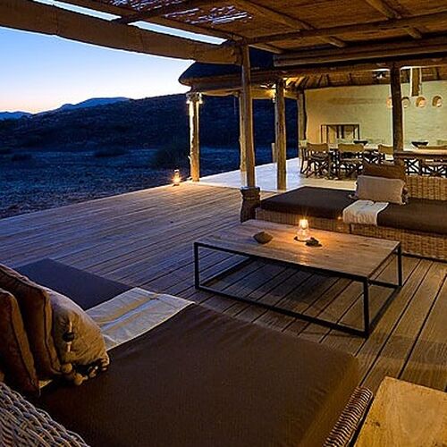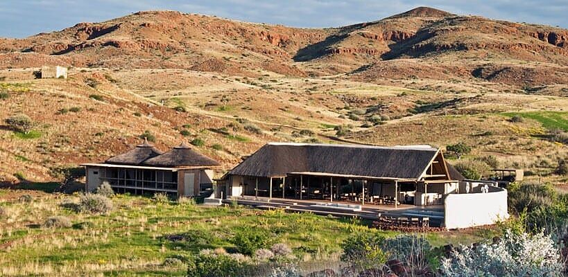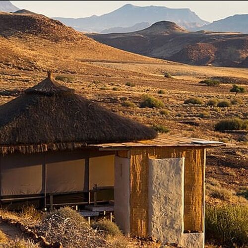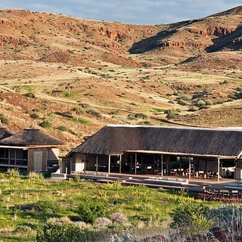 Damaraland Camp er beliggende i Torra Reservatet og har en ekseptionel udsigt over de omkringliggende ørkensletter, gamle dale og fjerne bjergtoppe af Brandberg Mountains.