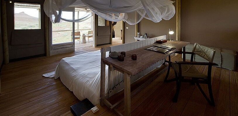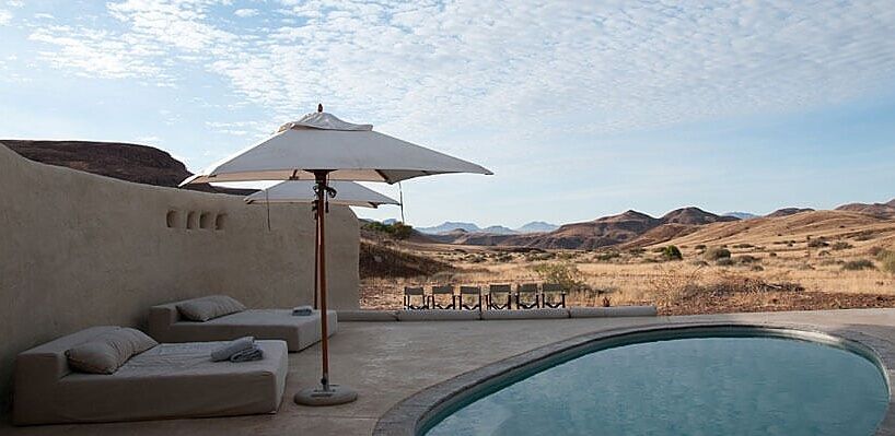 Ny teknologi blandes med gamle byggemetoder til at skabe innovativ, miljøvenlig luksus i ørkenen, i alt har Damaraland Camp 10 forhøjede adobe-stilede stråtækte enheder (herunder en familieenhed). En rummelig, stråtækt stue er komplet med pejs, bar og swimmingpool.