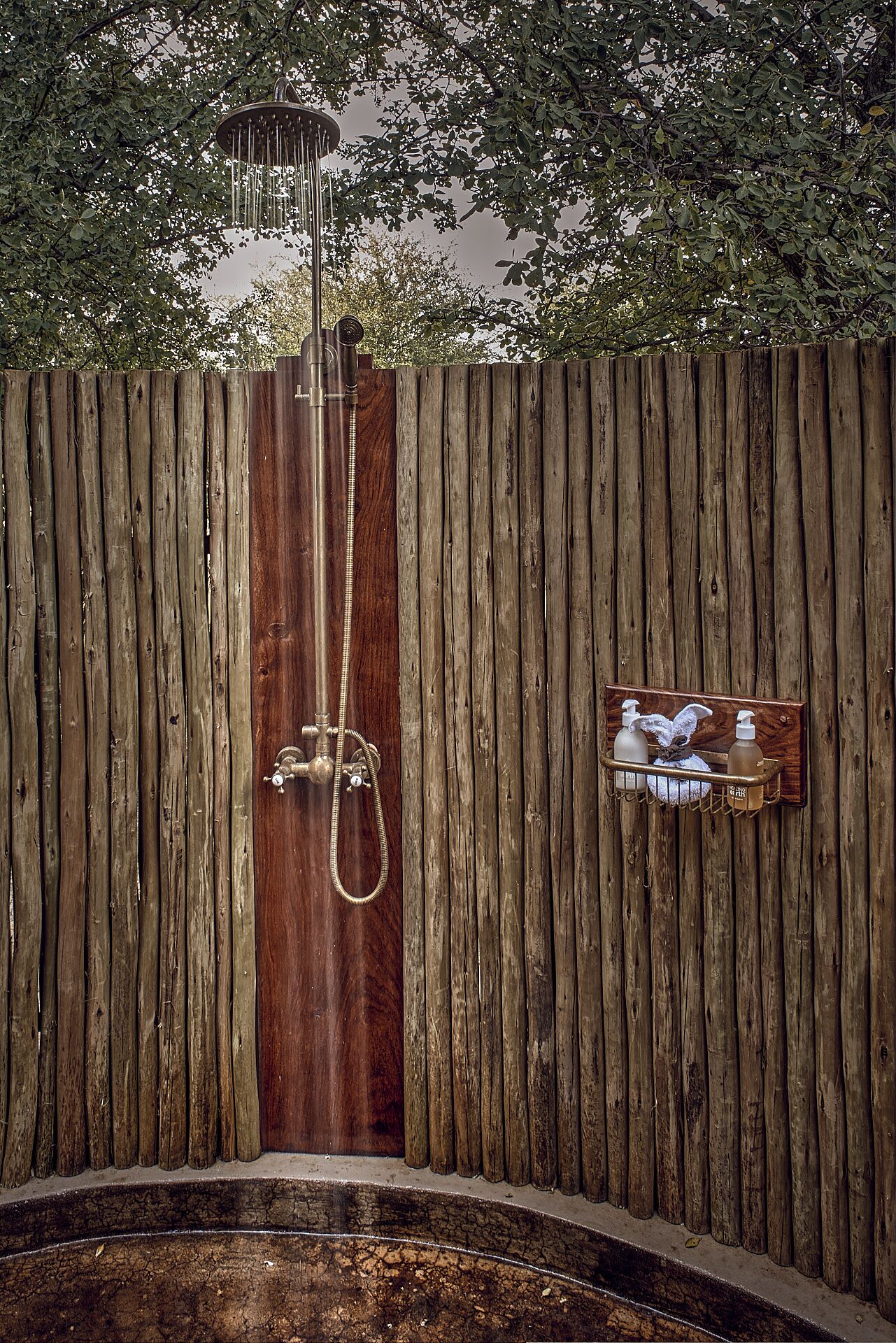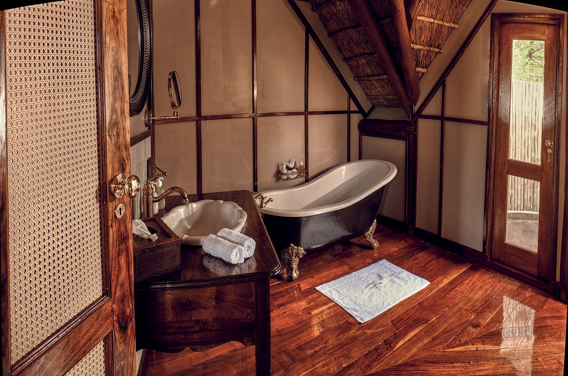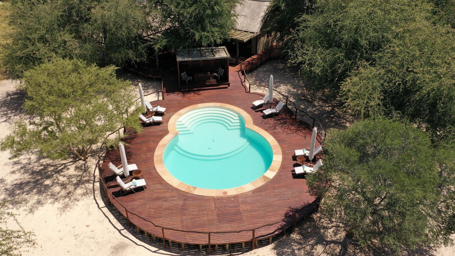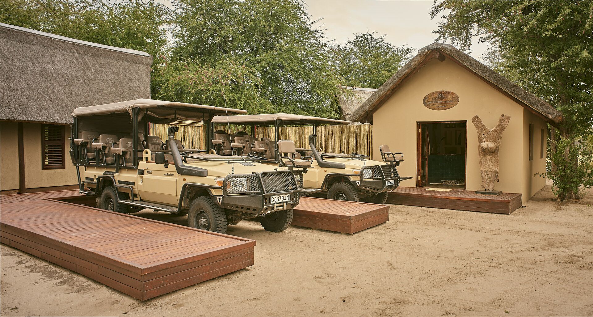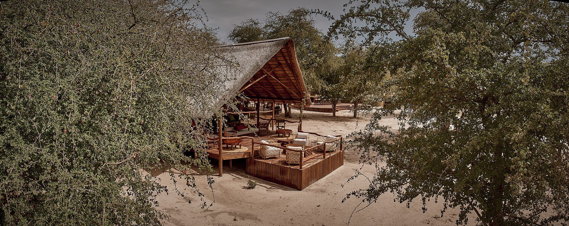 Hovedkomplekset kan prale af en spisestue, lounge og barområde indrettet i varme Kalahari-farver, som gør brug af afrikanske artefakter. Fra dækket kan man se de vilde dyr ved det nærliggende vandhul. Lodgen har et etnisk afrikansk tema og blev bygget til at passe ind i den omgivende busk uden at ændre, beskadige eller forringe dens stemning og farve.