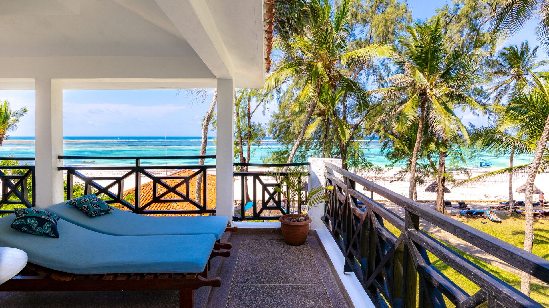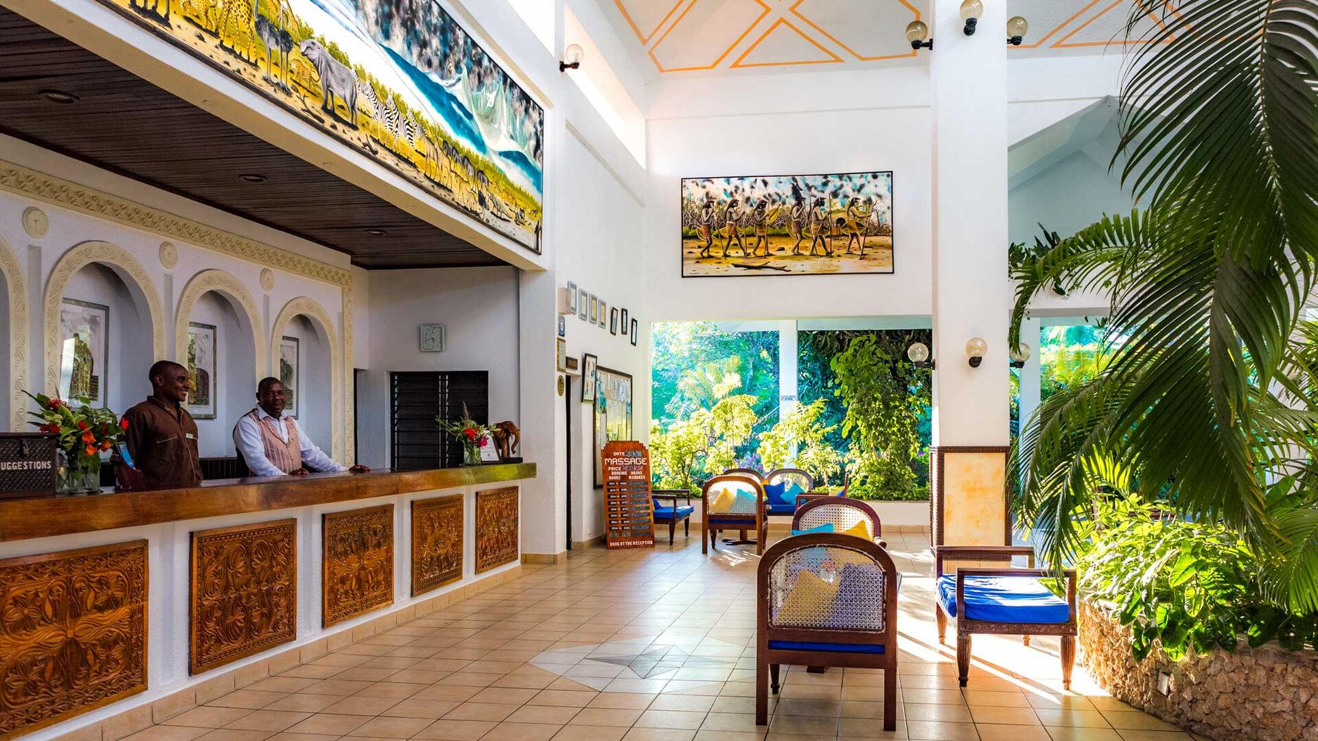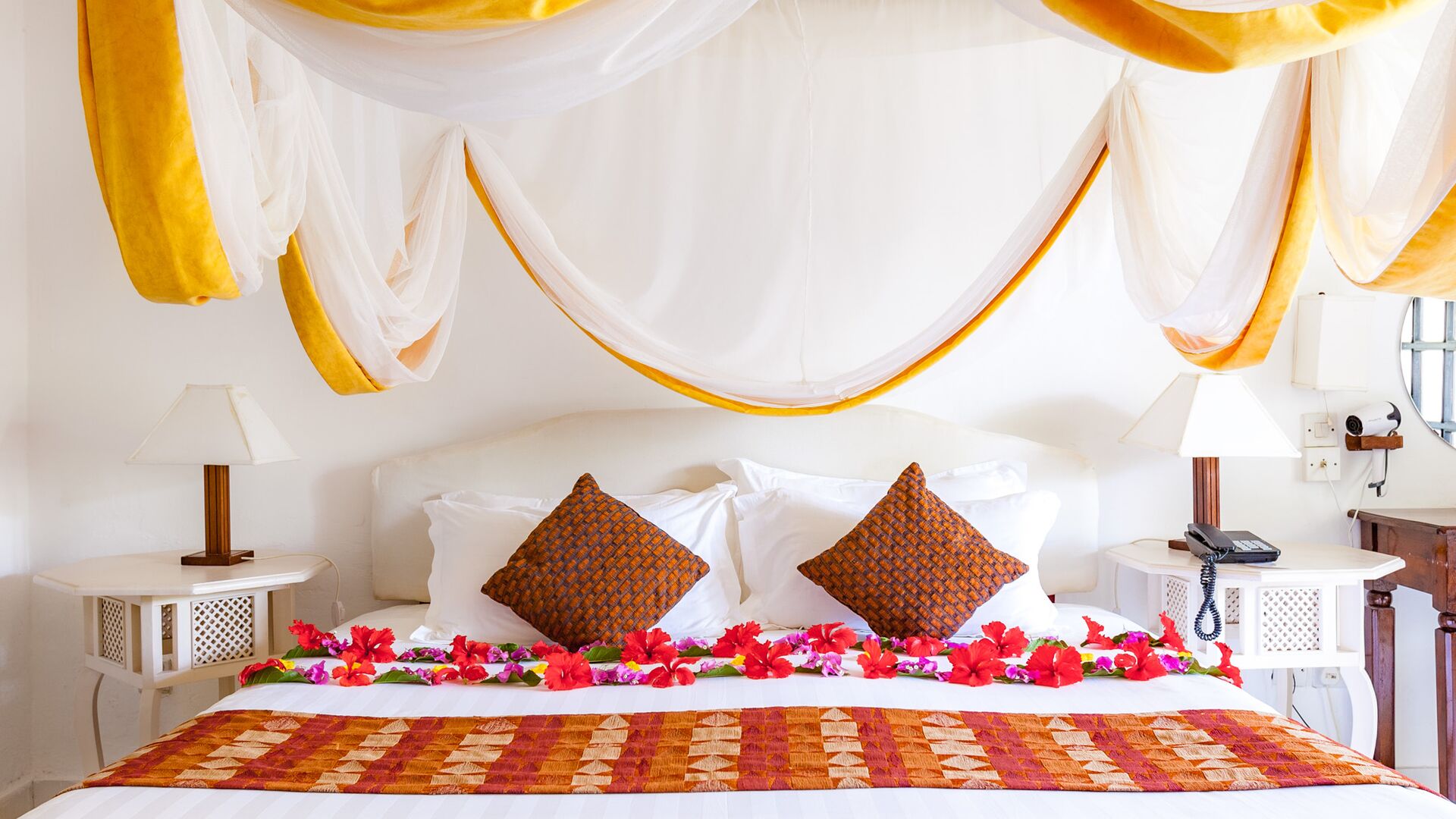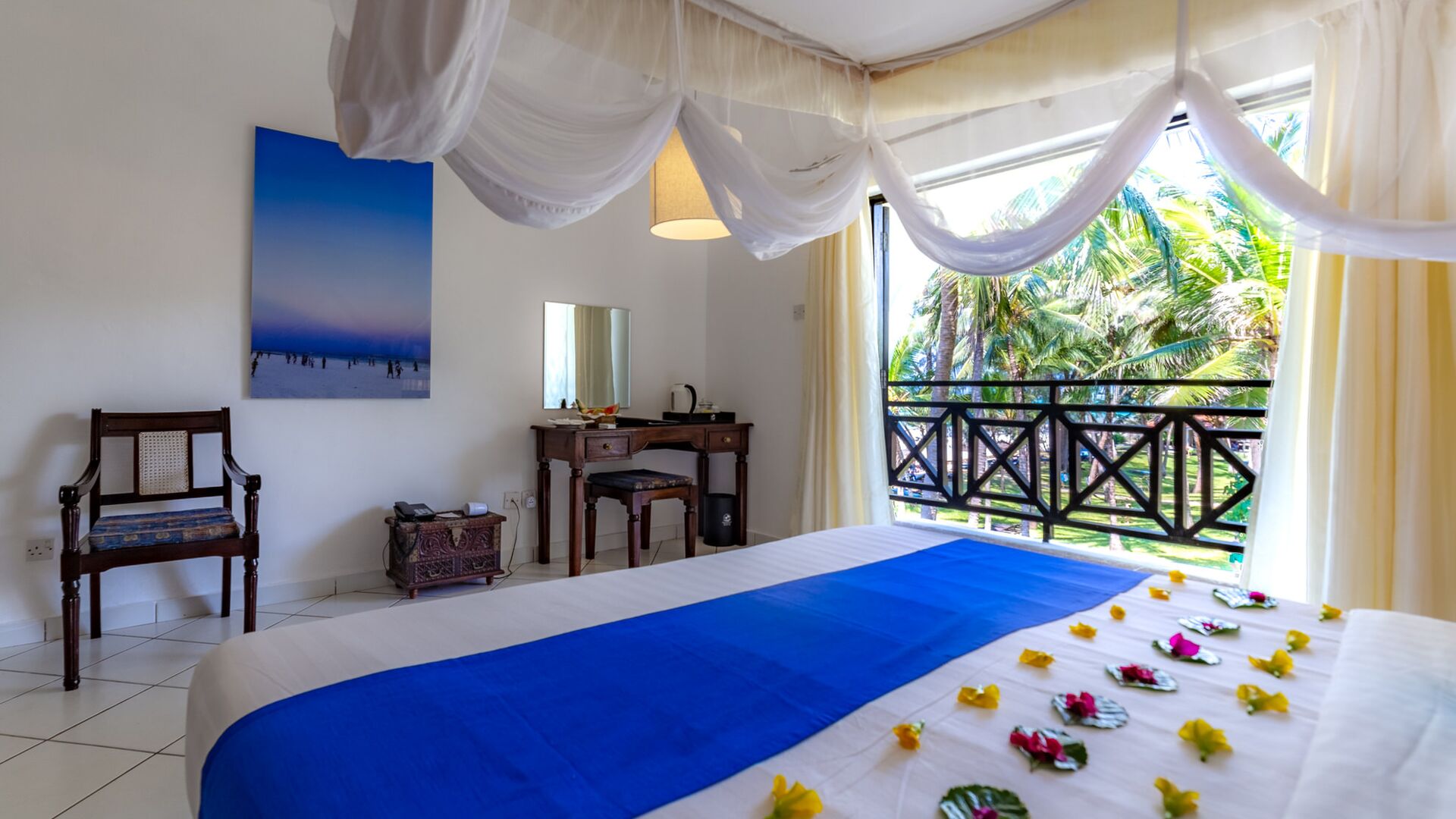 Nyd omgivelserne på altanen med en smuk sideudsigt over Det Indiske Ocean, tættere på poolen og havet. Alle møbler er lavet af lokalt træ i lokal afrikansk stil. De har myggenet, split-level aircondition, pengeskab, bruser, toilet, bidet samt telefon, minikøleskab, som genopfyldes dagligt af all inclusive madplanen, tefaciliteter og satellit-tv.
