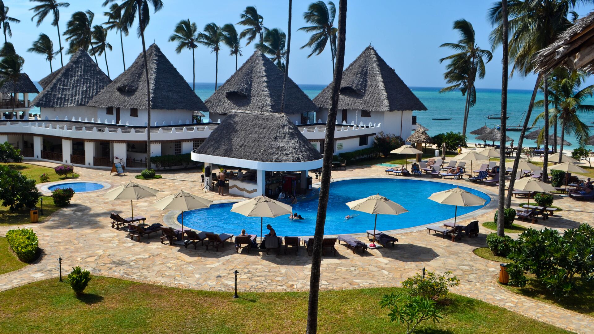 Double Tree Resort by Hilton Zanzibar, Nungwi, med de palmebladsbeklædte tage, ligger ved stranden i den større landsby Nungwi på Zanzibars nordspids tæt på den eftertragtede Nungwi Beach og blot 5 minutters gang fra bymidten. Hotellets tropiske have har udendørs pool.