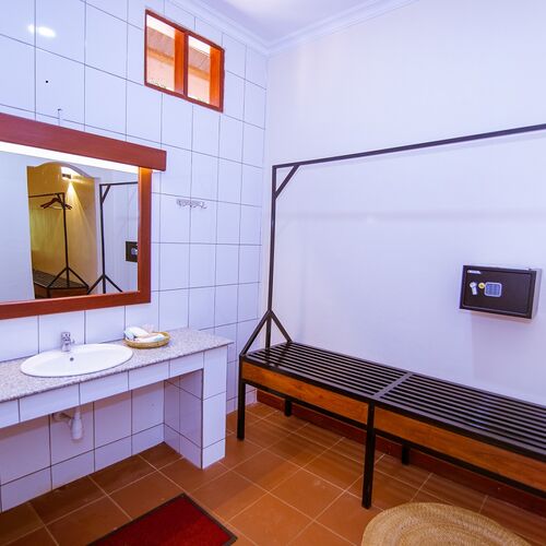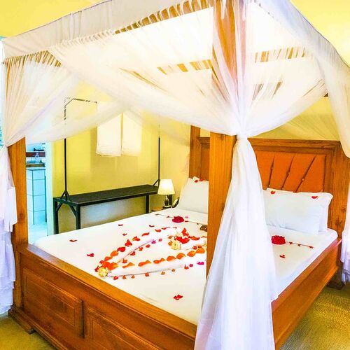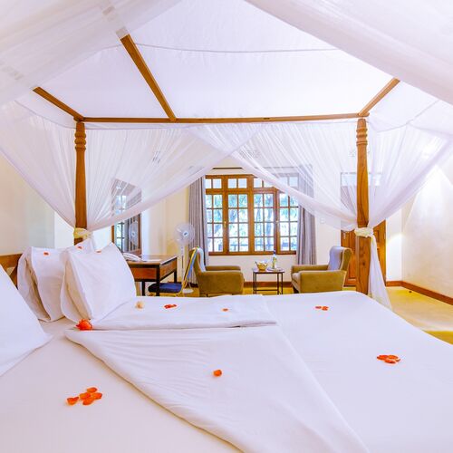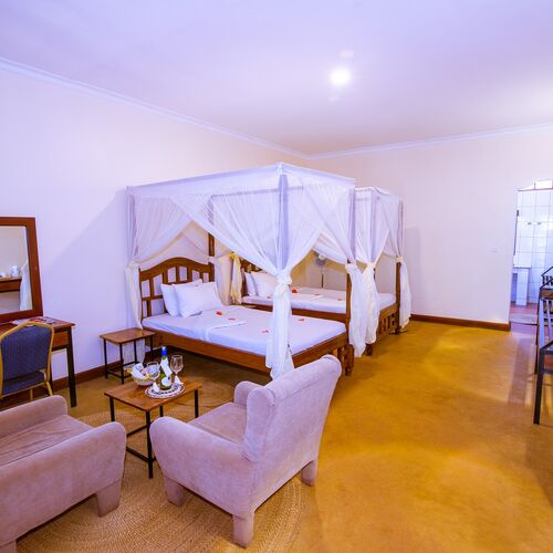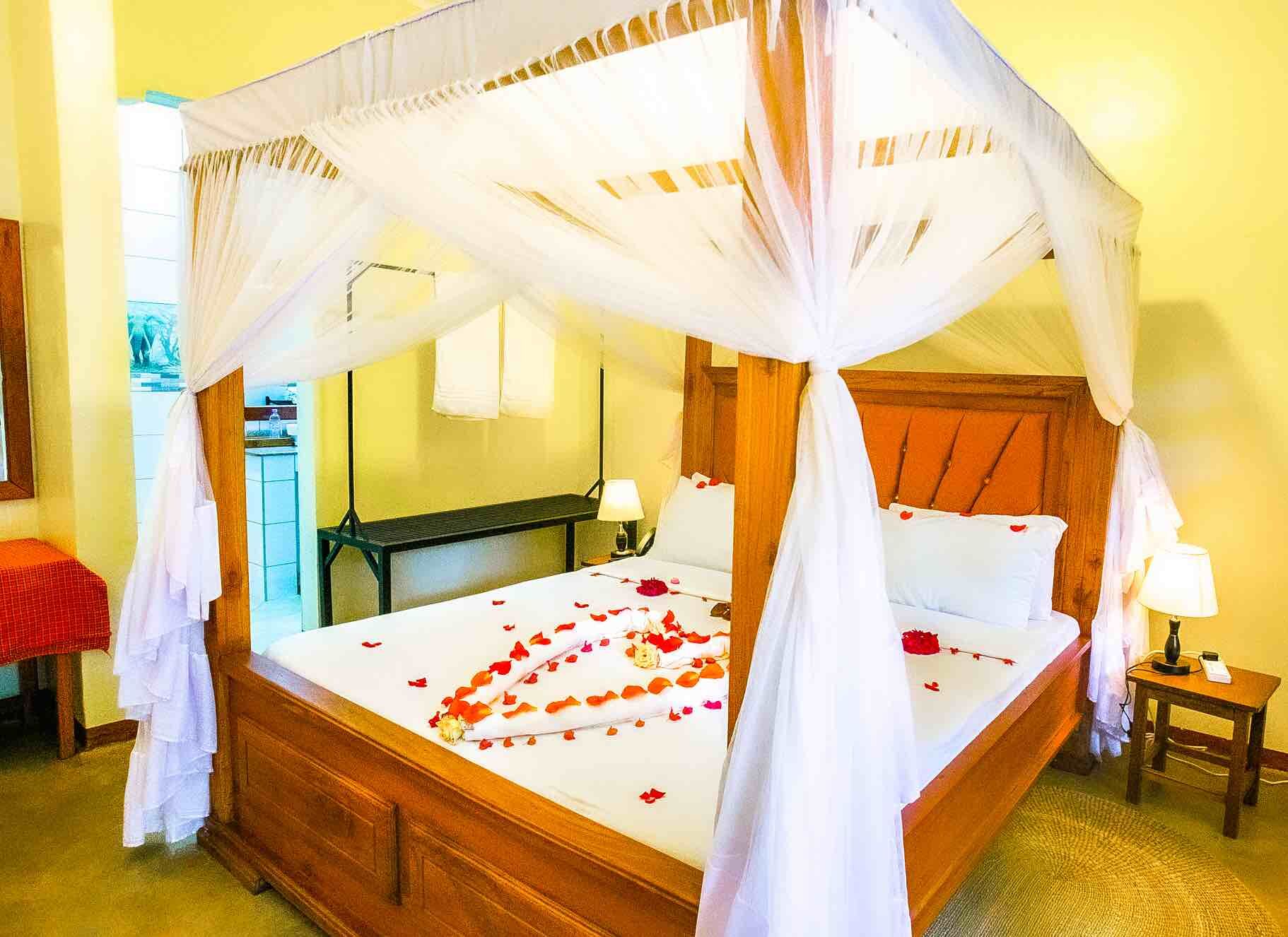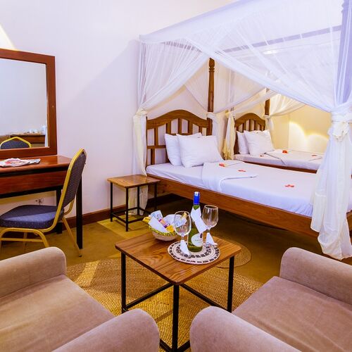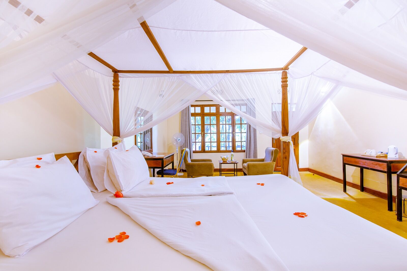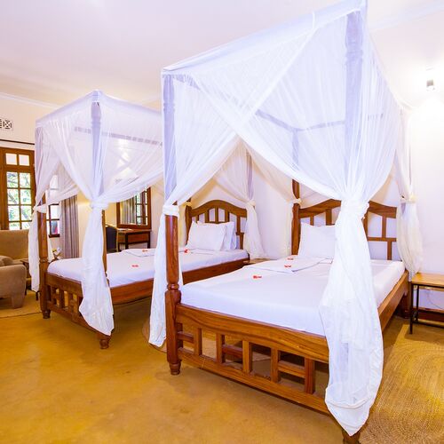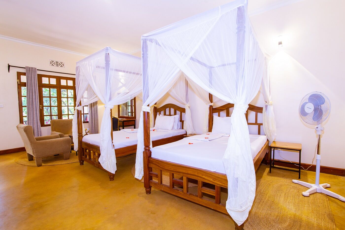 Hvert værelse har enten to enkeltsenge eller en stor dobbeltseng med myggenet, og tredobbeltværelser er tilgængelige på forespørgsel.
