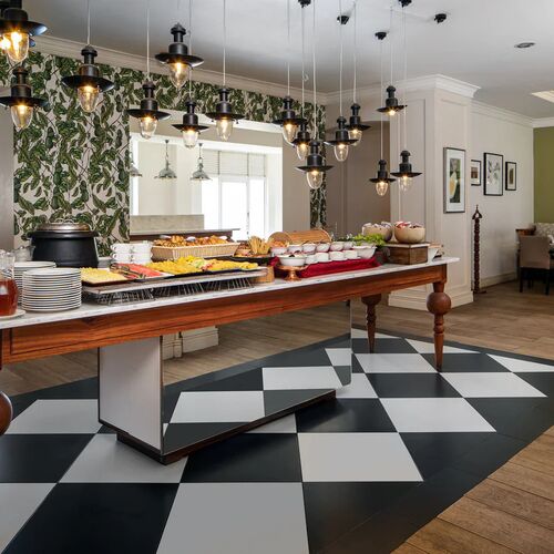 Det indbydende interiør og en rolig terrasse med udsigt over haven, giver de perfekte rammer til et lækkert måltid.