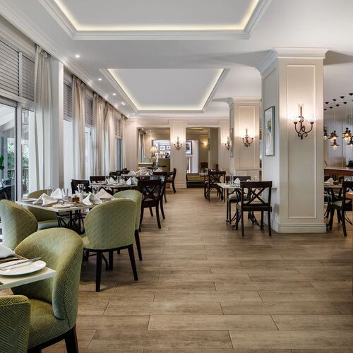 À la carte byder på europæiske, asiatiske og østafrikanske retter som suppleres af et omfattende vinkort.