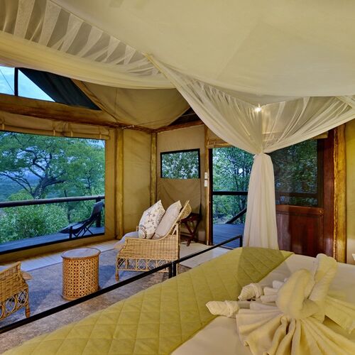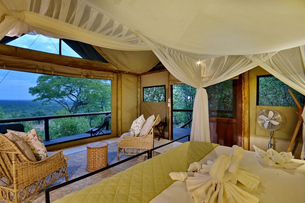 Lodgen har 11 luksustelte: 9 dobbelttelte og 2 familietelte, alle med private udsigtsdæk, hvorfra gæsterne kan nyde den spektakulære udsigt. Teltene er udstyret med eget badeværelse med dobbelt håndvask, separat toilet og bruser, samt møbleret med komfortable lænestole, skabe, bagagestativer, ventilatorer og myggenet. Der er også strømudtag til opladning af elektronisk udstyr og en personlig værdiboks