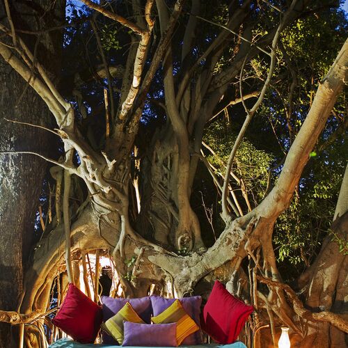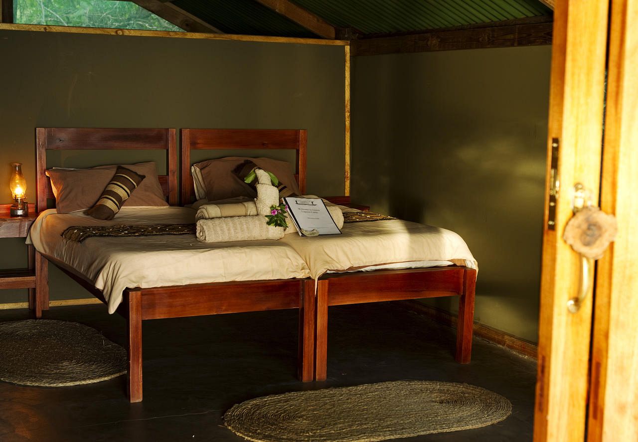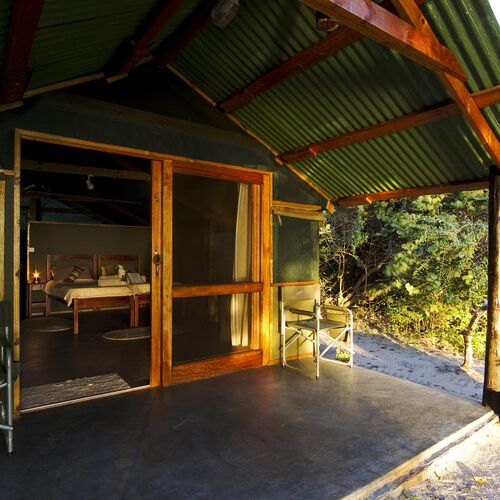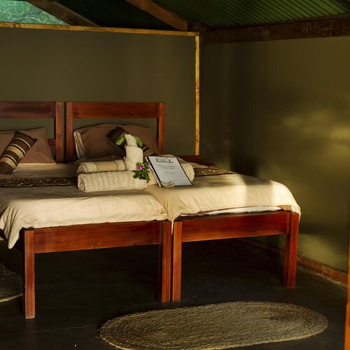 Indkvartering tilbydes i rummelige canvas-hytter, alle med eget bad og beliggende på kanten af lagunen. Alternativt har vi syv campingpladser under skyggefulde træer med private afvaskninger. Hver hytte har plads til to personer med dejlige teak senge, ensuite badeværelser giver varme brusere og skylletoiletter. Myggenet og håndklæder er også til rådighed. Restauranten byder på dejlige måltider tilberedt af campens dygtige kokke.