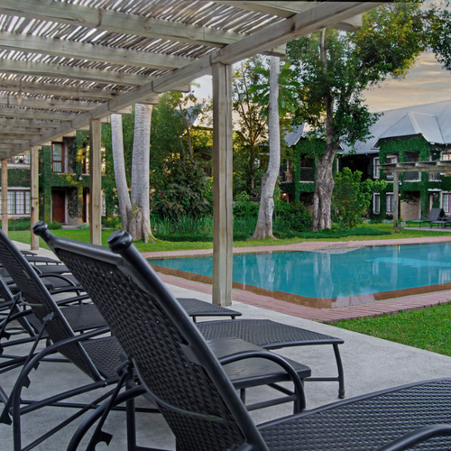 Lodgen har en dejlig pool og flotte udendørsomgivelser, hvor blandt andet bygningerne er smukt dekoreret af naturligt egeføg, der dækkerne murerne på bygningerne. Et meget smukt syn fra poolen og haven især.