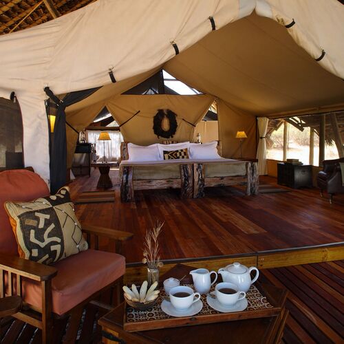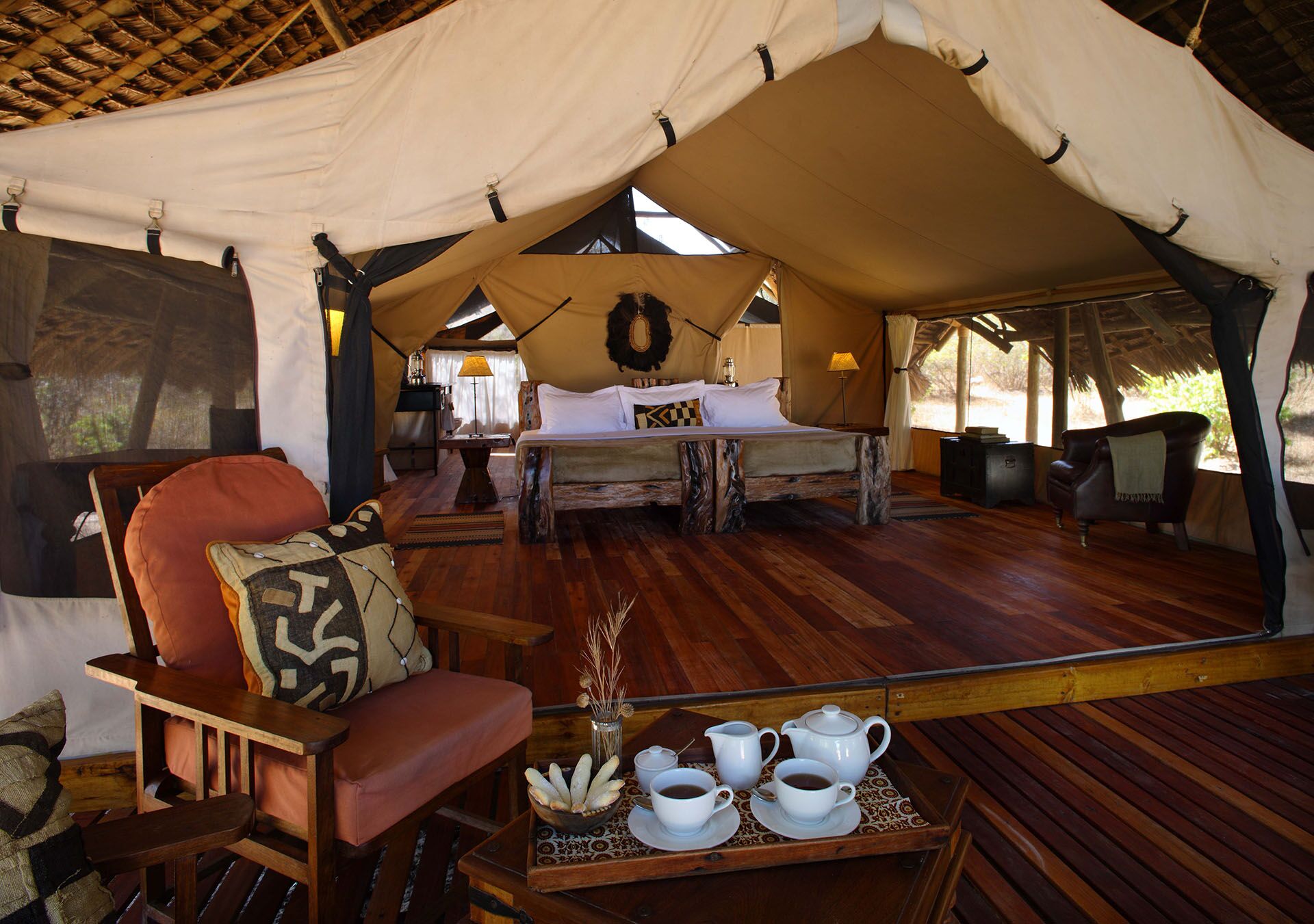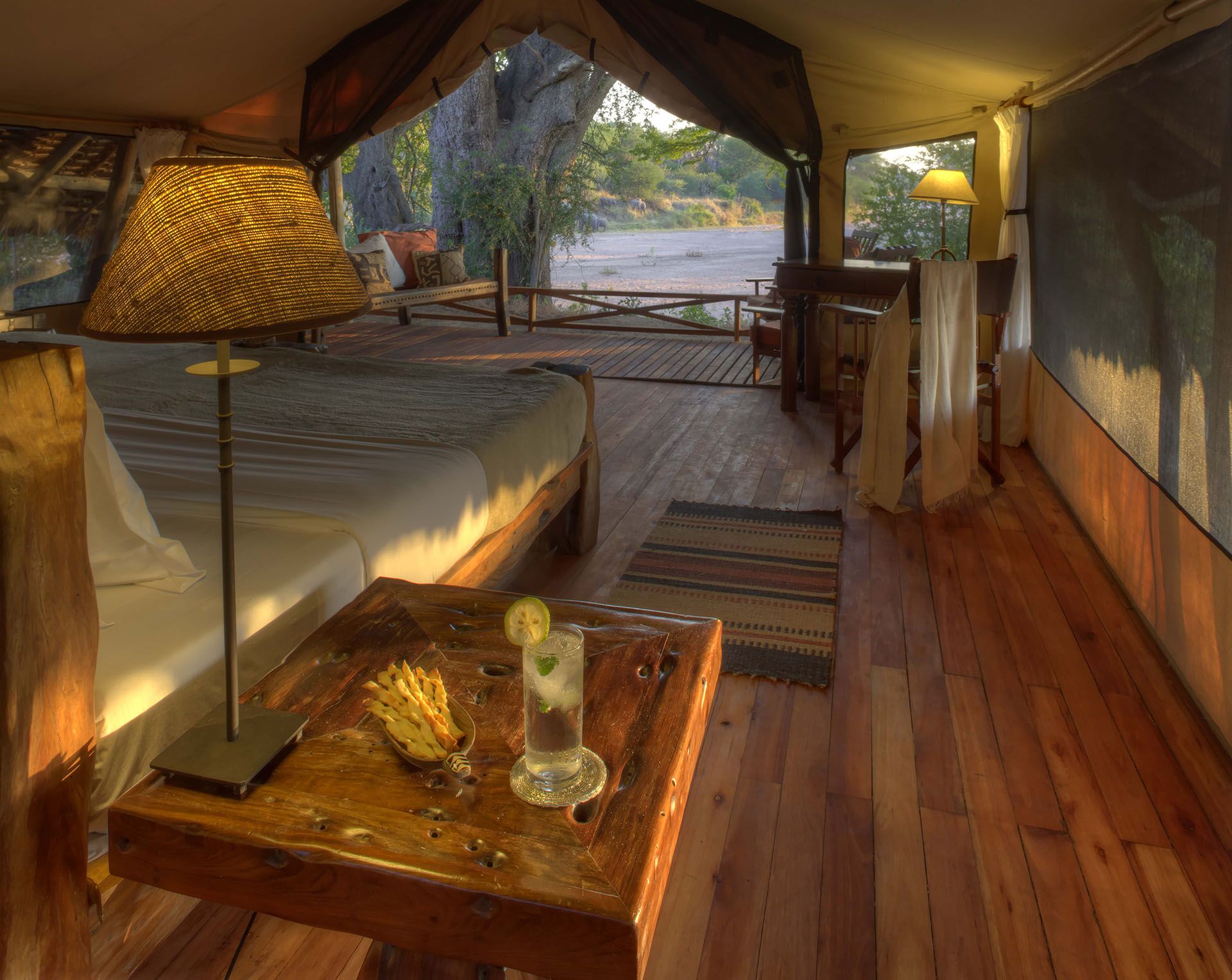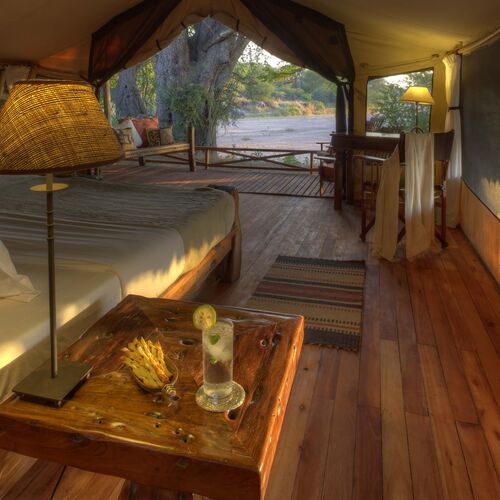 Der er otte store og yderst veludstyrede teltsuiter med lækre badeværelser, alle placeret under enorme stråtag, som også dækker en rummelig privat veranda.