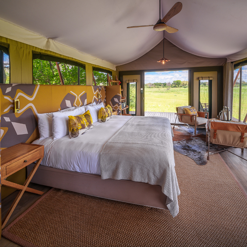 Karangoma tilbyder 6 rummelige telte (inklusive et familieværelse), som er skjult på en træbevokset halvø, skygget af leadwood- og pølse-træer, der stikker ud i en Okavango-flodslette og har udsigt over en velbenyttet dyresti til vandet. Et soveværelse og en lounge (stilfuldt indrettet med en moderne fortolkning af teksturer, farver og mønstre inspireret af den ikoniske Hambukushu-kurveflet fra det nordlige Okavango), samt et tilstødende badeværelse og indendørs og udendørs brusere, maksimerer udsigten over flodsletten. Lounge- og spiseområderne har også en imponerende udsigt over flodsletten, som på visse tidspunkter af året er tør og på andre tider dækket af vandet, med et nærliggende ildsted og en lille pool, der fuldender de offentlige områder.