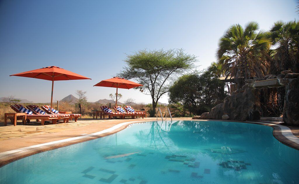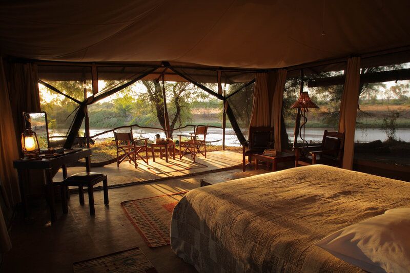 Larsen Camp ligger ved Uaso Nyrio/Ewaso Ngiro River i Samburu National Reserve, Isiolo, Kenya, ca 350 km nord for Nairobi.