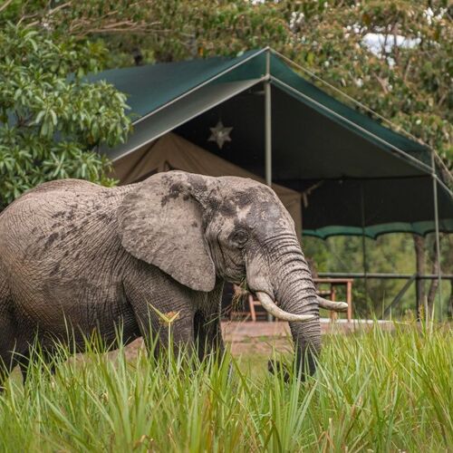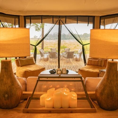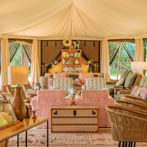 Indkvarteringen sker i campens gæstetelte, som alle er forsynet med trægulv. Alle telte har eget badeværelse med bruseniche, skylletoilet, varmt og koldt rindende vand. Fra hvert telts store tilhørende træveranda kan man betragte den livlige aktivitet omkring det naturlige vandhul tæt ved campen.