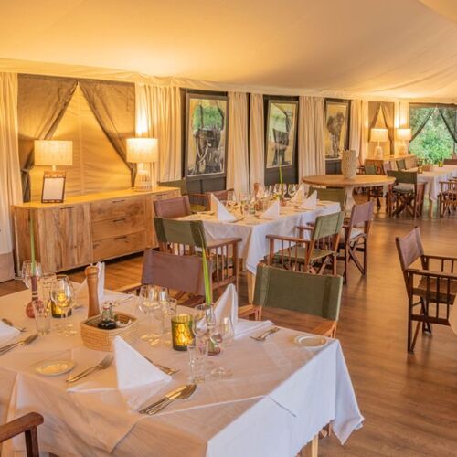 Morgenmad og frokost serveres under åben himmel, og vortesvinefamilierne vandrer ofte rundt mellem bordene. Da hele området er uindhegnet, besøger alle slags dyreliv lejren, og gæsterne skal muligvis gøre plads til elefanter, som ofte besøger i frokosttid! Om aftenen brænder en varmende pejs foran barteltet, og der serveres en middag med levende lys i det nærliggende spisetelt. Picnic/pakkemåltider kan tilbydes til dem, der gerne vil ud på hel- eller halvdags game drives (snacks tilbydes også i bilerne). Bush-måltider kan bestilles mod et tillægsgebyr.