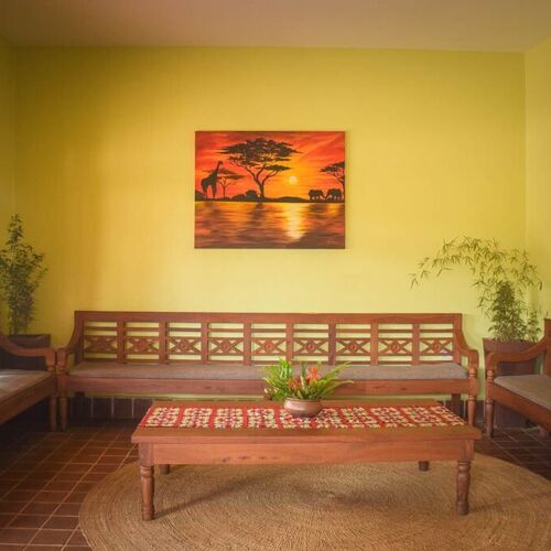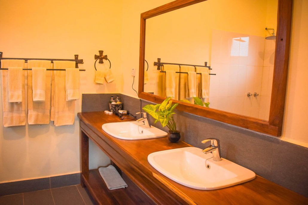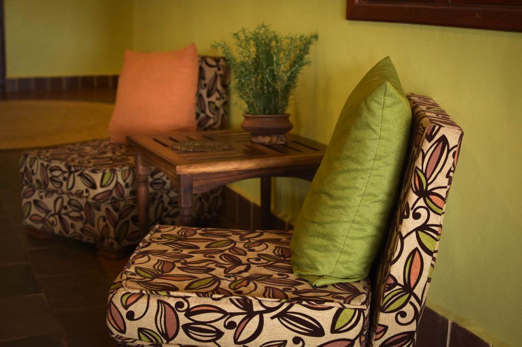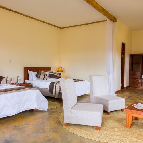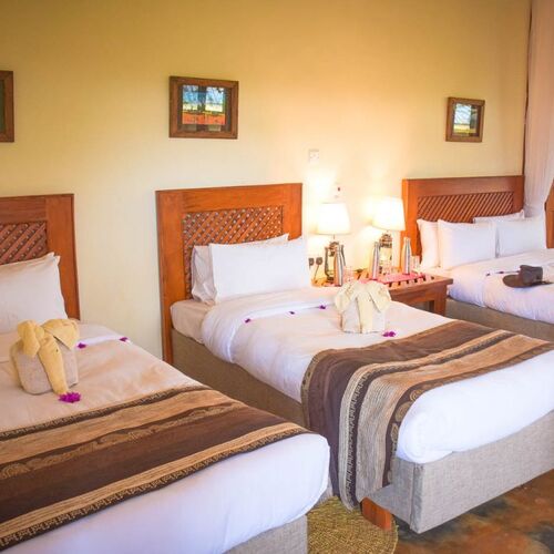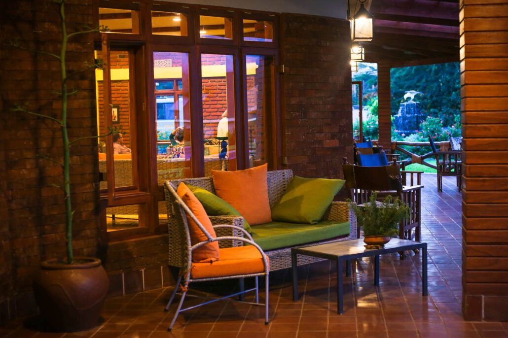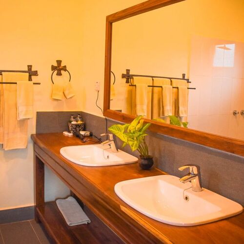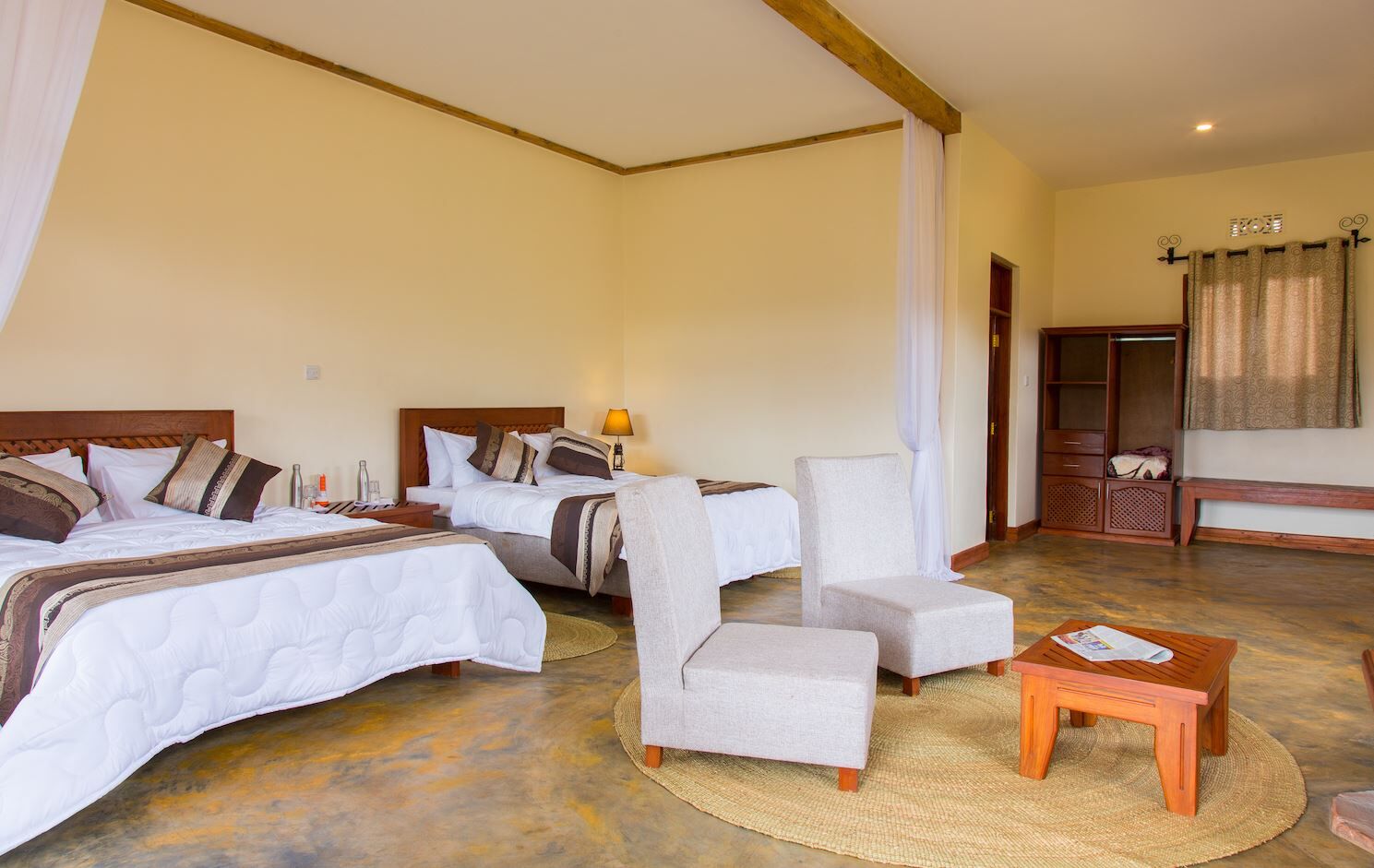 De 28 hytter er rummelige og lyse med udsigt til de frodigt anlagte haver. Hvert værelse har kaffe-/tefaciliteter, myggenet, store komfortable senge (familie- og sammenhængende værelser er tilgængelige), pejs, opholdsområde, skrivebord, rigelig garderobe og bagageplads samt en privat veranda. Alle en-suite badeværelser er komplet med faciliteter såsom brusegel, shampoo og balsam og masser af bløde håndklæder.