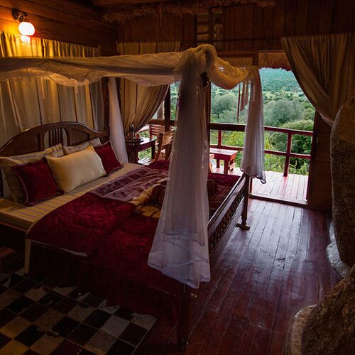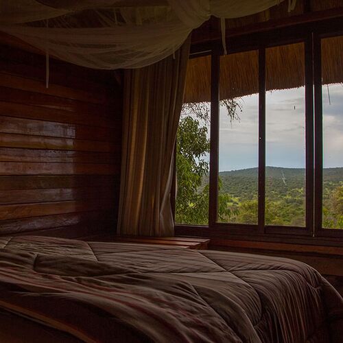 Lodgen byder på luksuriøse hytter i Afrikansk stil, bygget i træ og med stråtækt tag. Hytterne har alle eget toilet og bad, samt en privat balkon med en fantastisk udsigt til Mburo søen, hvor der ofte befinder sig et rigt dyreliv.