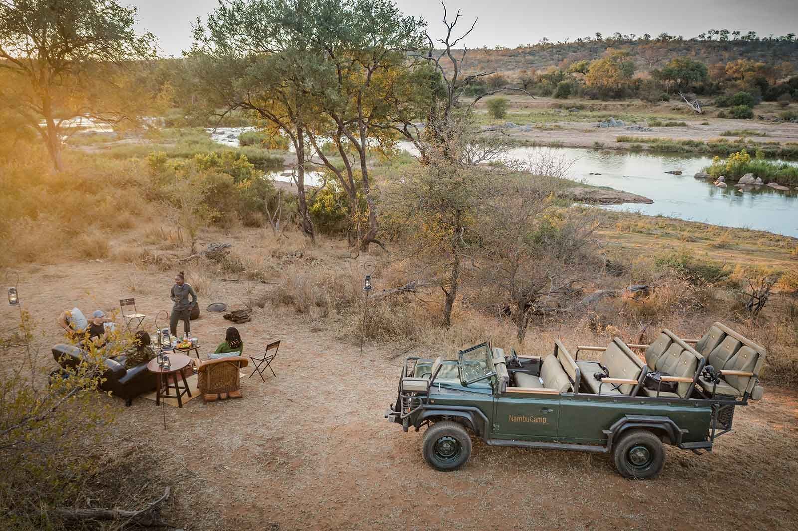 Højt beliggende, midt i hjertet af Greater Kruger i Olifants West Nature Reserve, ligger Nambu Camp. Dette vilde og alsidige reservat er hjem for The Big Five og et væld af dyreliv. Campen har udsigt over et snoet tørt flodleje og et vandhul. Der er også naturlige kilder spredt i flodlejet, hvilket tiltrækker mange dyr til denne lille oase.