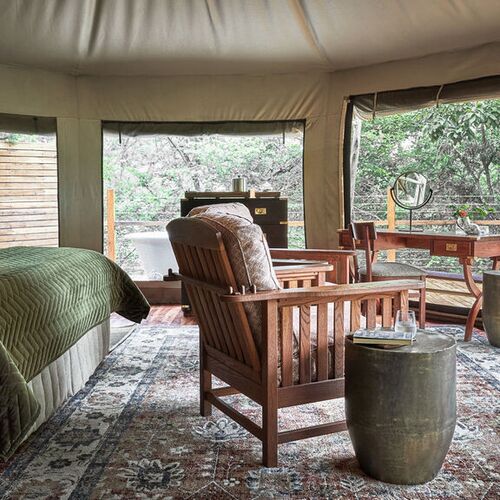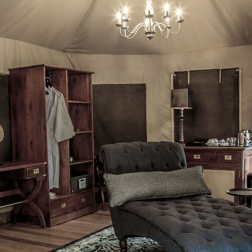 Luxury-teltene har udover ovennævnte Kingsize-bed eller twin-bed, og tilbyder en meget bekvemmelig og luksuriøs indretning med virkelig smuk udsigt ud over floden.