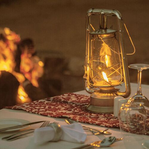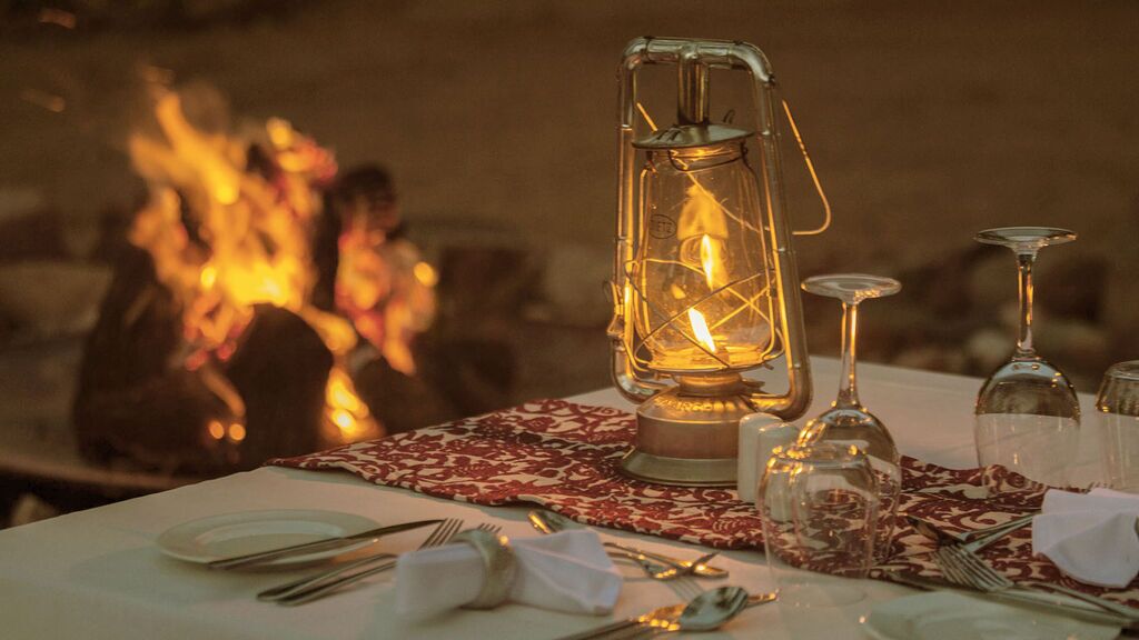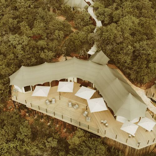 Alle måltider indtages i campens hovedteltet. Teltet er smukt indrettet og byder på dejlige zoner til afslapning. Terrassen er f.eks. et fantastisk sted at nyde aftendrinken.