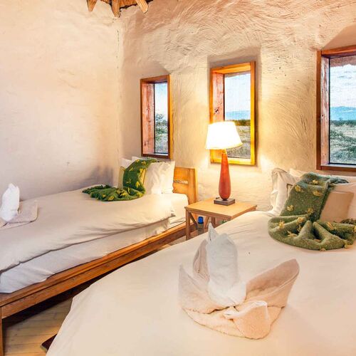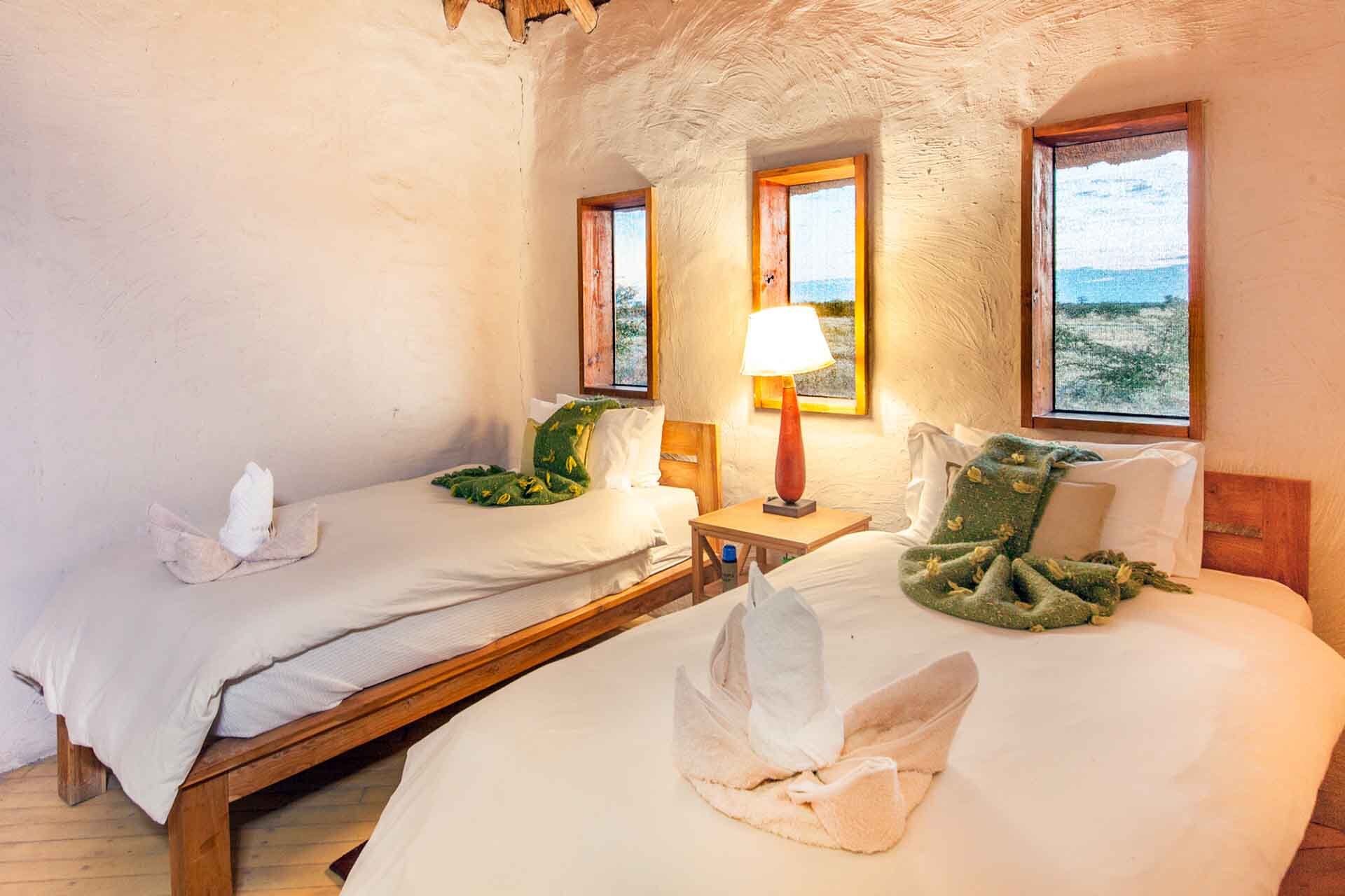Campens 8 lyse og rummelige værelser har maksimalt 18 gæster. Campen er stråtækt og bygget i materialer specieldesignet til områdets svingende temperaturer.