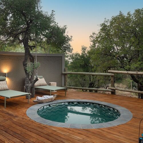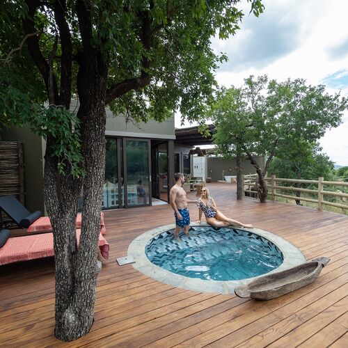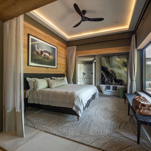 Med udsigt til bjerge, flot indretning, king-size seng, air-condition, vifte i loftet, lounge, en-suite badeværelse med badekar og bruser, udendørs badekar og bruser, badekåber, badetøfler, hårtørrer, åbent udsigtsområde ovenpå, stor privat terrasse, splash pool og solsenge, udendørs møbler, kaffe/the faciliteter, minibar og køleskab.