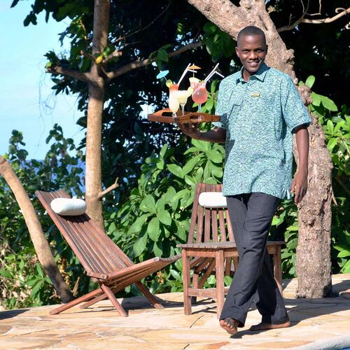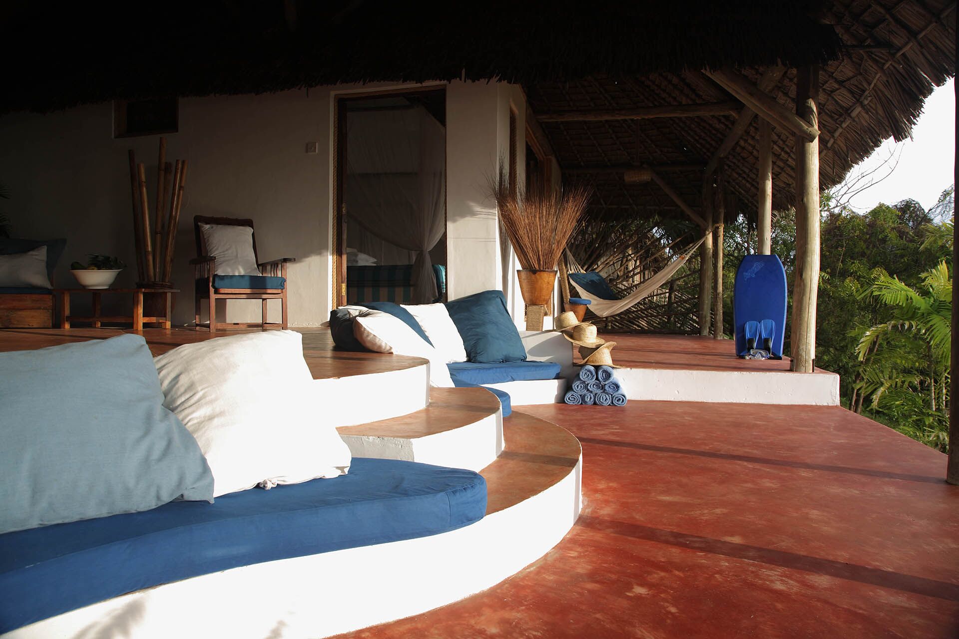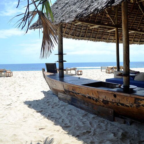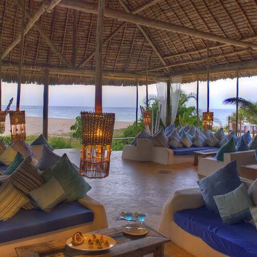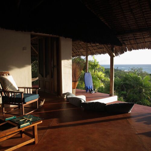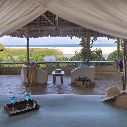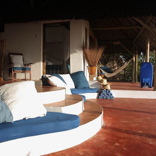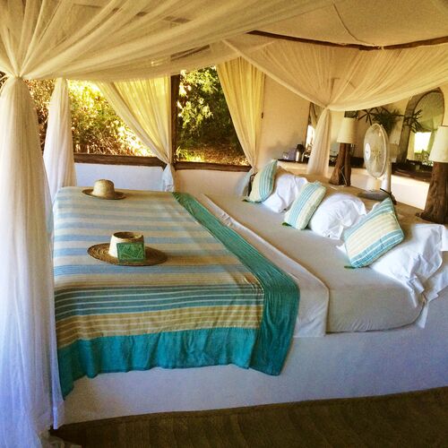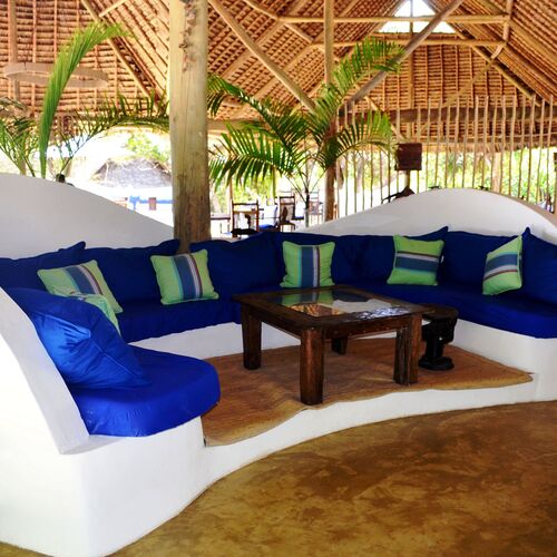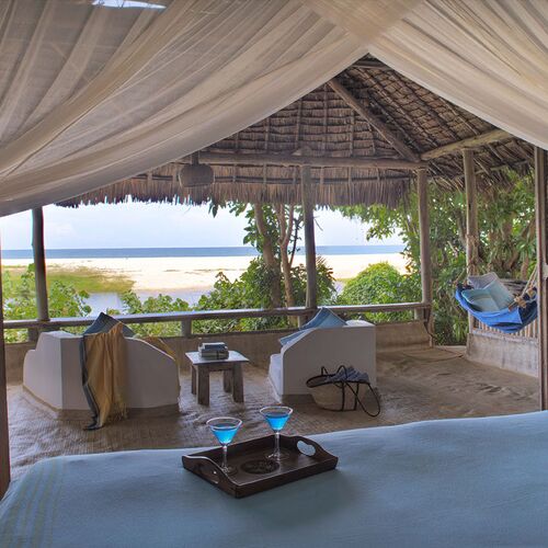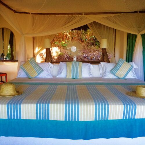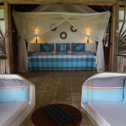 Der er tolv rummelige, charmerende hytter og fire suiter, alle bygget i naturlige, lokale materialer som harmonerer perfekt med de vidunderlige omgivelser. Etniske møbler og tekstiler giver en god fornemmelse af det multi-kulturelle Tanzania. Hver hytte har naturligvis eget badeværelse og en stor veranda med skøn udsigt over det azurblå oecan og lagunen.