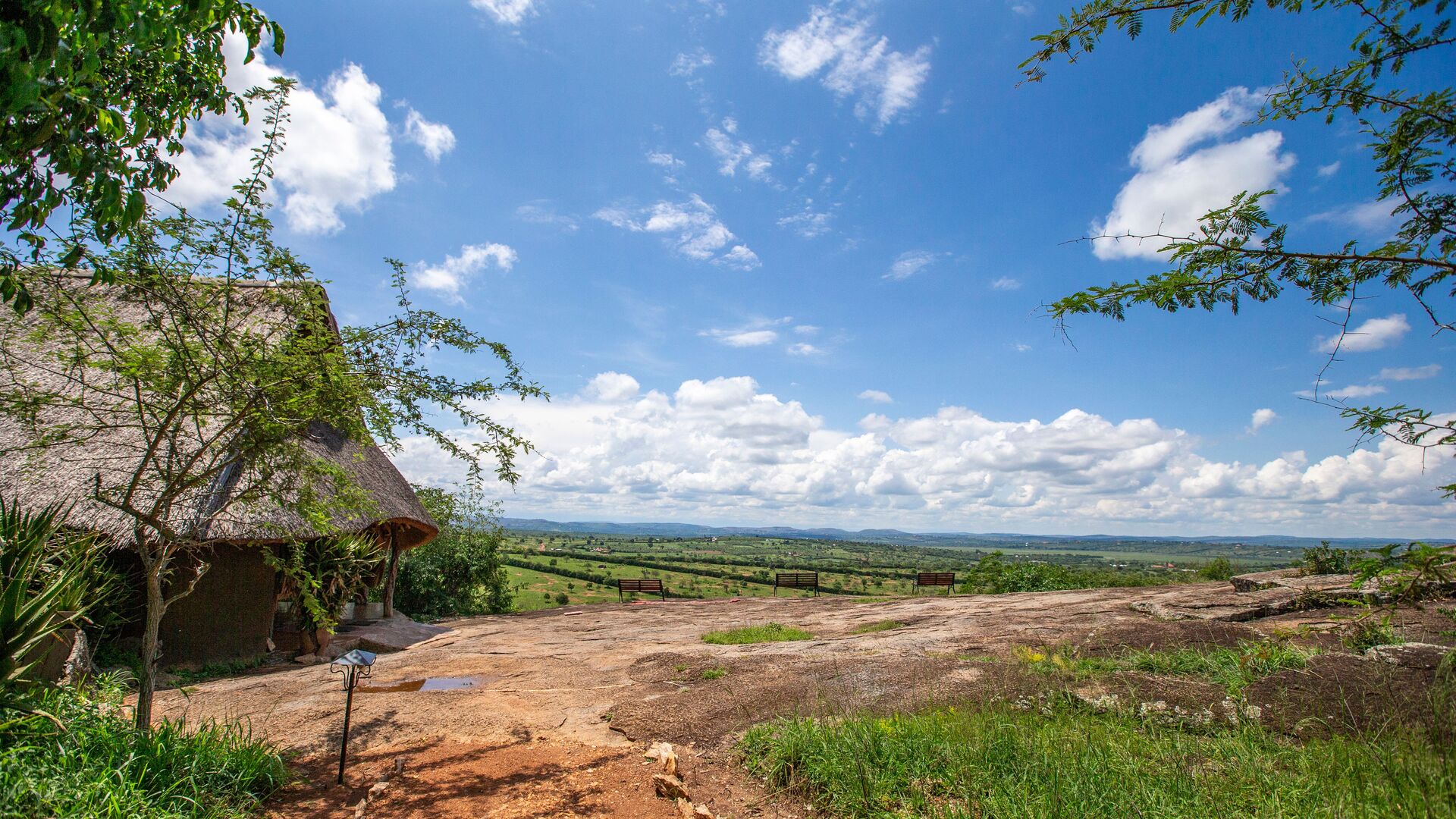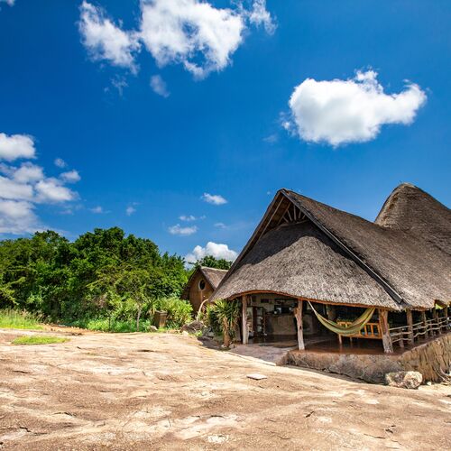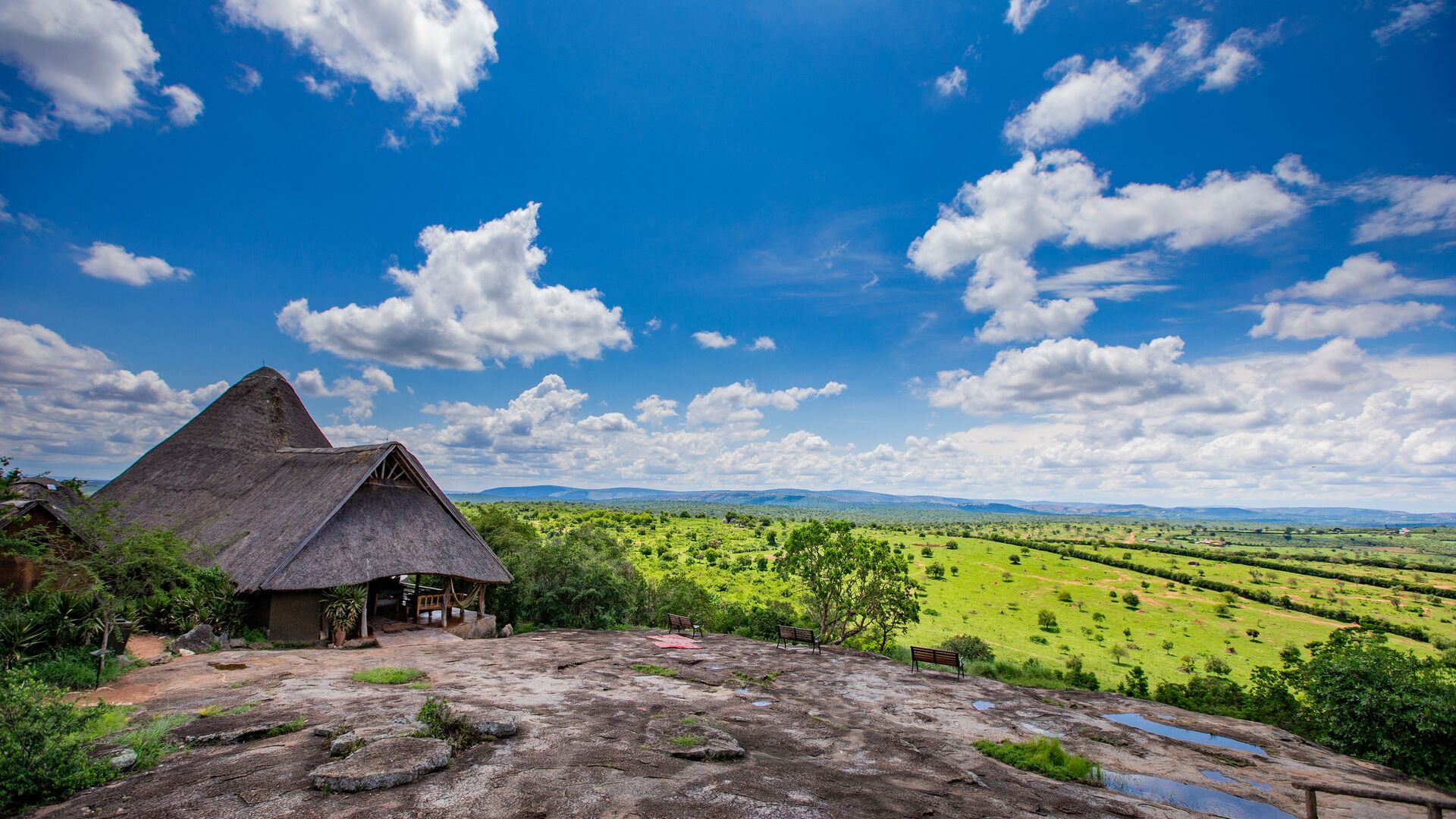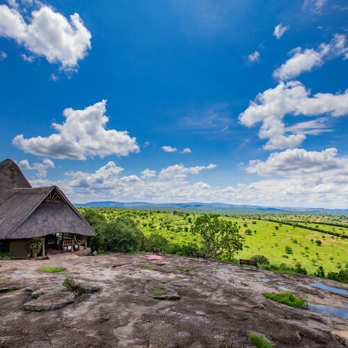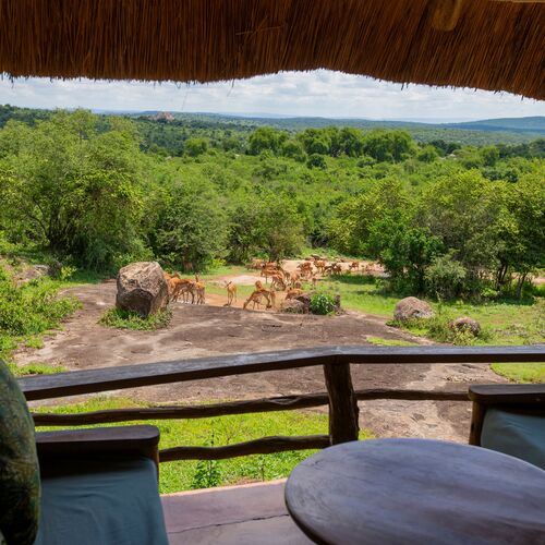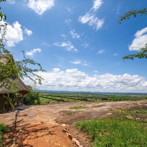 Rwando Rock er beliggende på en naturskøn klippe med betagende udsigt. Dyr som zebra, warthog, impala og bushbuck florerer rundt om hytterne og samles ofte ved vandhullet, som kan ses fra spiseområdet.