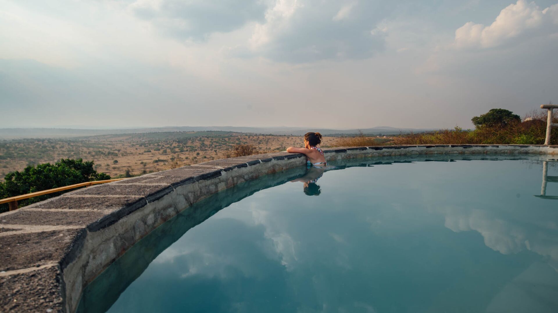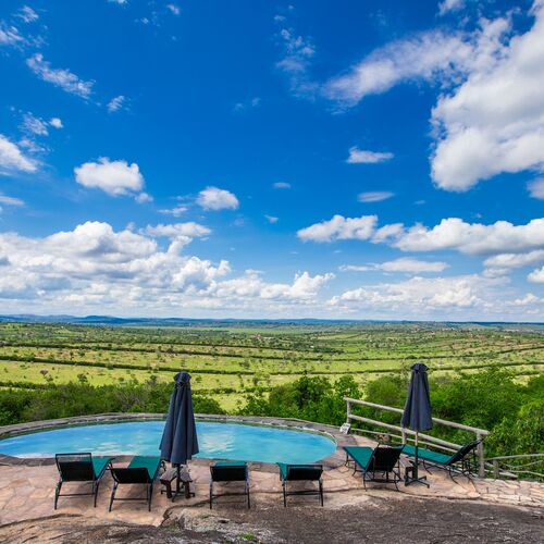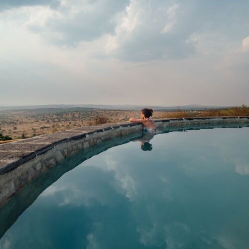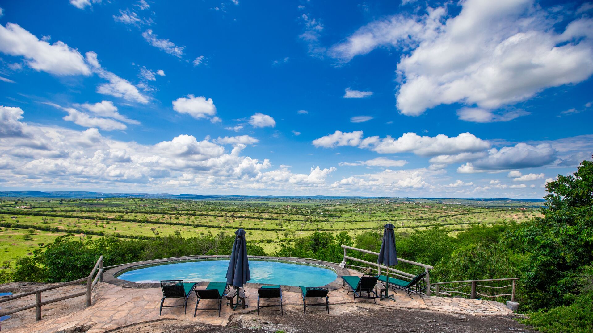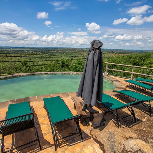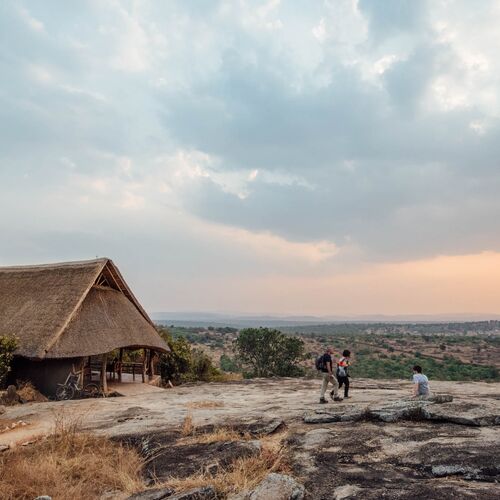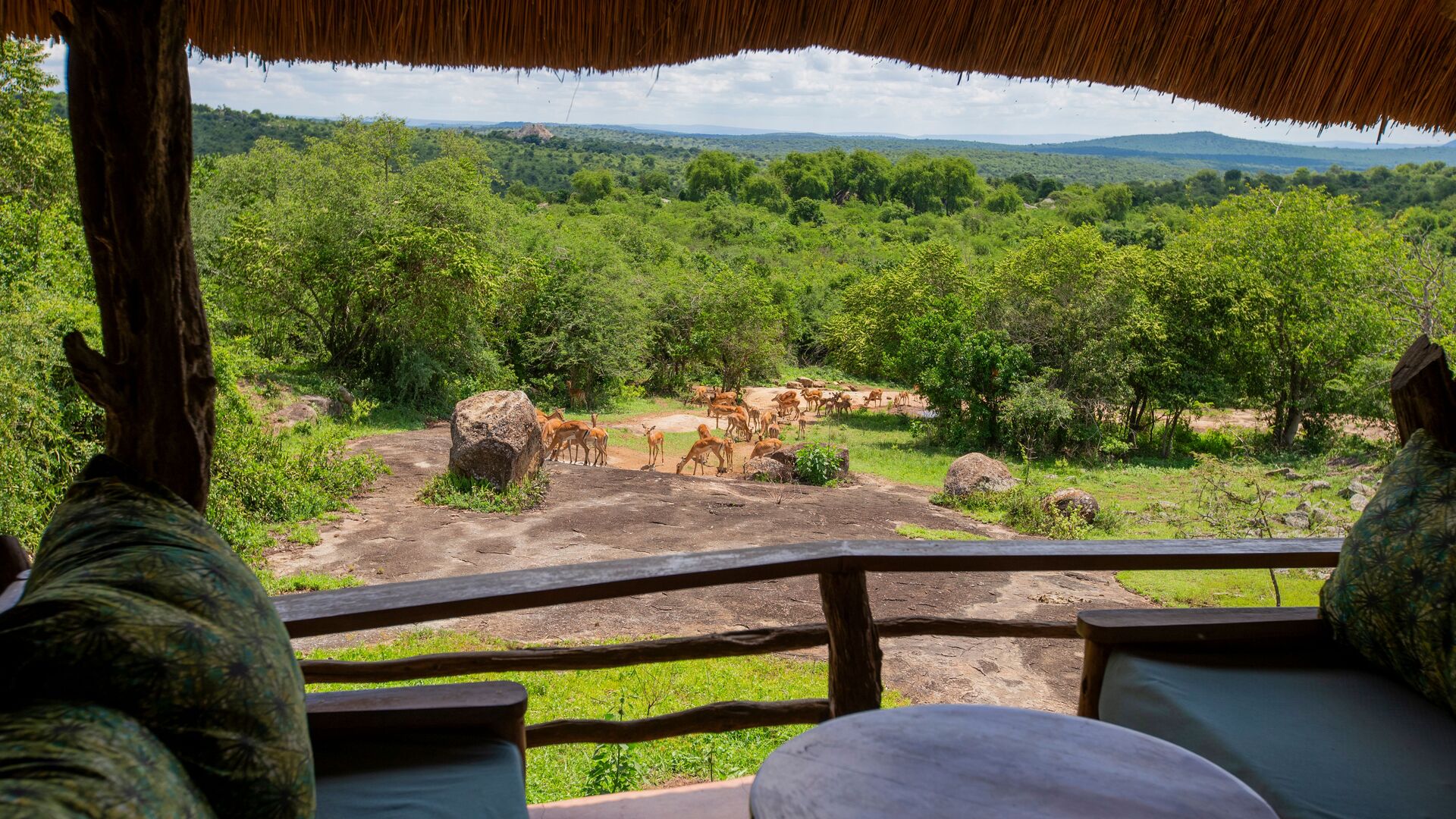 Rwando Rock er beliggende på en naturskøn klippe med betagende udsigt. Dyr som zebra, warthog, impala og bushbuck florerer rundt om hytterne og samles ofte ved vandhullet, som kan ses fra spiseområdet.