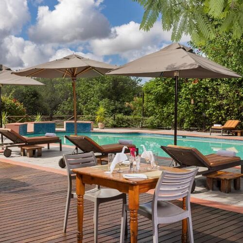 Den store swimmingpool er omgivet af en hævet teaktræsplatform og skygges af et enormt jacarandatræ, hvor du kan nyde måltider og forfriskninger.
