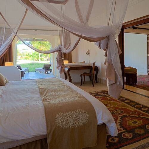 Ressortet har 140 værelser i kategorierne standard, superior og executive, alle meget rummelige og indrettet i nutidig luksuriøs stil med inspiration fra swahilikulturen. Fra værelsernes verandaer er der udsigt til hav eller pool- og haveomgivelser. Vandet i stedets mageløse pool løber over 200 meter i syv faldende niveauer helt ud til strandkanten.