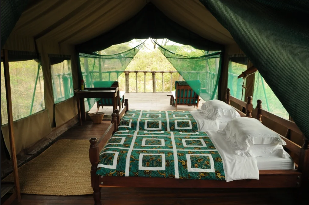 Elleve rummelige, forhøjede luksustelte tilbyder forskellige arrangementer af dobbelt- eller enkeltsenge. Ekstra senge er tilgængelige for børn eller en tredje person. Belysningen leveres af solenergi døgnet rundt, og hvert telt står mindst otte meter væk fra det næste for fuldstændig privatliv og afsideshed. Det indbyggede badeværelse bag hvert telt er indrammet i strå og sten og har udsigt over bushen. Solopvarmede brusere tilbydes. Foran hvert telt er der en rummelig veranda med komfortable siddepladser, perfekt til afslapning og dyresafari langs Mdweka-sandfloden.