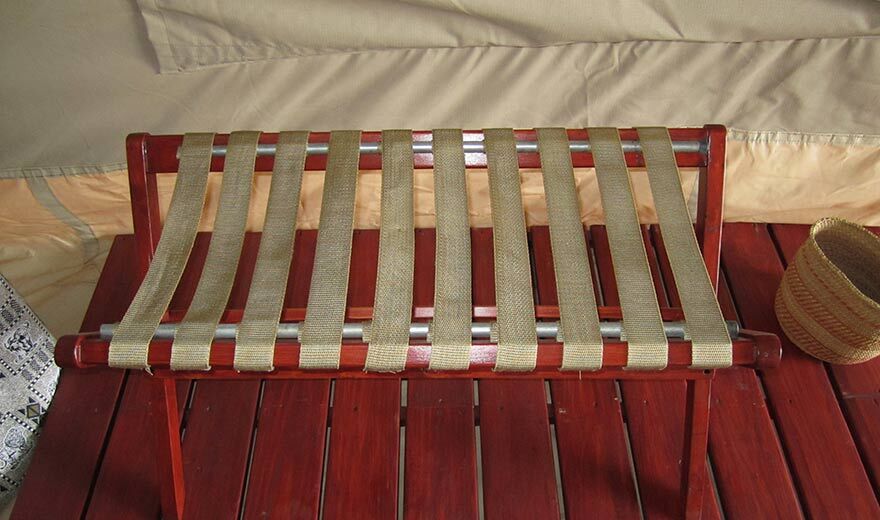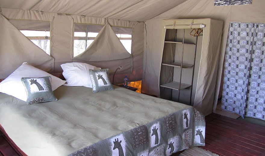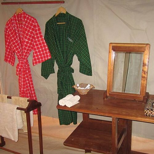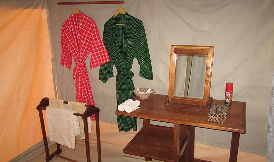 De luksuriøse telte er høje og rummelige, så man kan både stå og gå inde i dem. Der er gode senge af træ, madrasser, dyner, tæpper, puder og sengeborde. Der er moskitonet både for "vinduerne" sDer er toilet-og badfaciliteter bagerst i teltet og afskærmet af kanvas teltdug. Udenfor teltet er der en veranda med to safaristole og bord, så man kan sidde udenfor sit telt og nyde naturen, lydene og slappe af midt i det afrikanske safarieventyr.