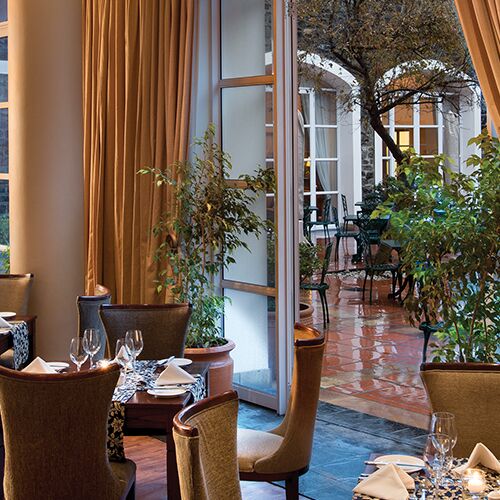 Fra restauranten er der udgang til gårdhavens rolige omgivelser, hvor I kan nyde den klassiske sundowner drink og slappe af ved den beroligende Koidam.