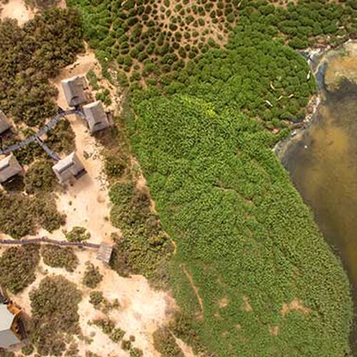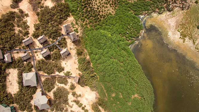 Arkitekturen af lodgens træbungalows bygget på søjler er unik, og hver bungalow er bygget ud fra de fineste detaljer med en træbro mellem hver bungalow og fællesområdet.