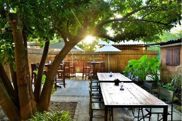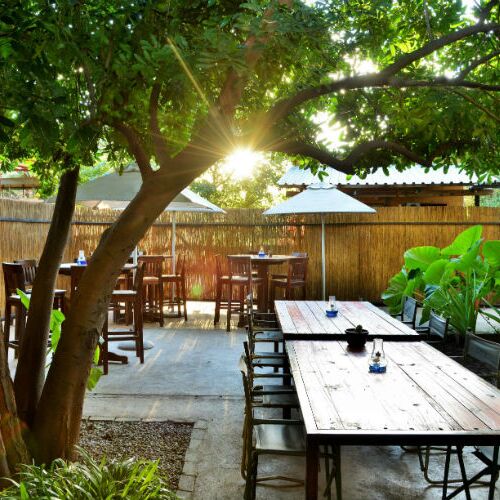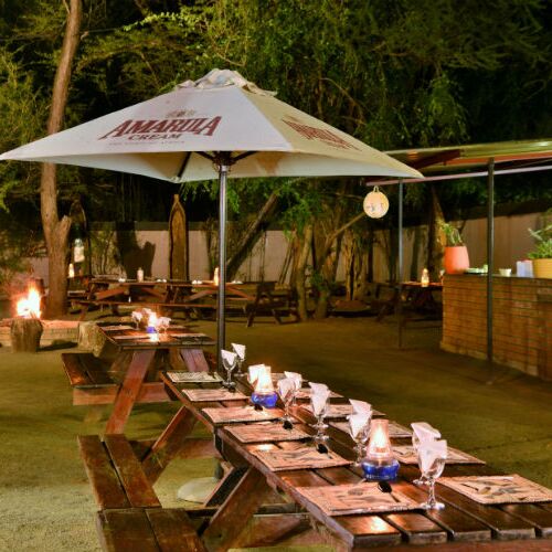 Thebe River Safaris tilbyder den perfekte ramme til at slappe af og nyde god mad og kolde drikkevarer inden for rammerne af sin rustikke restaurant- og barområde.
