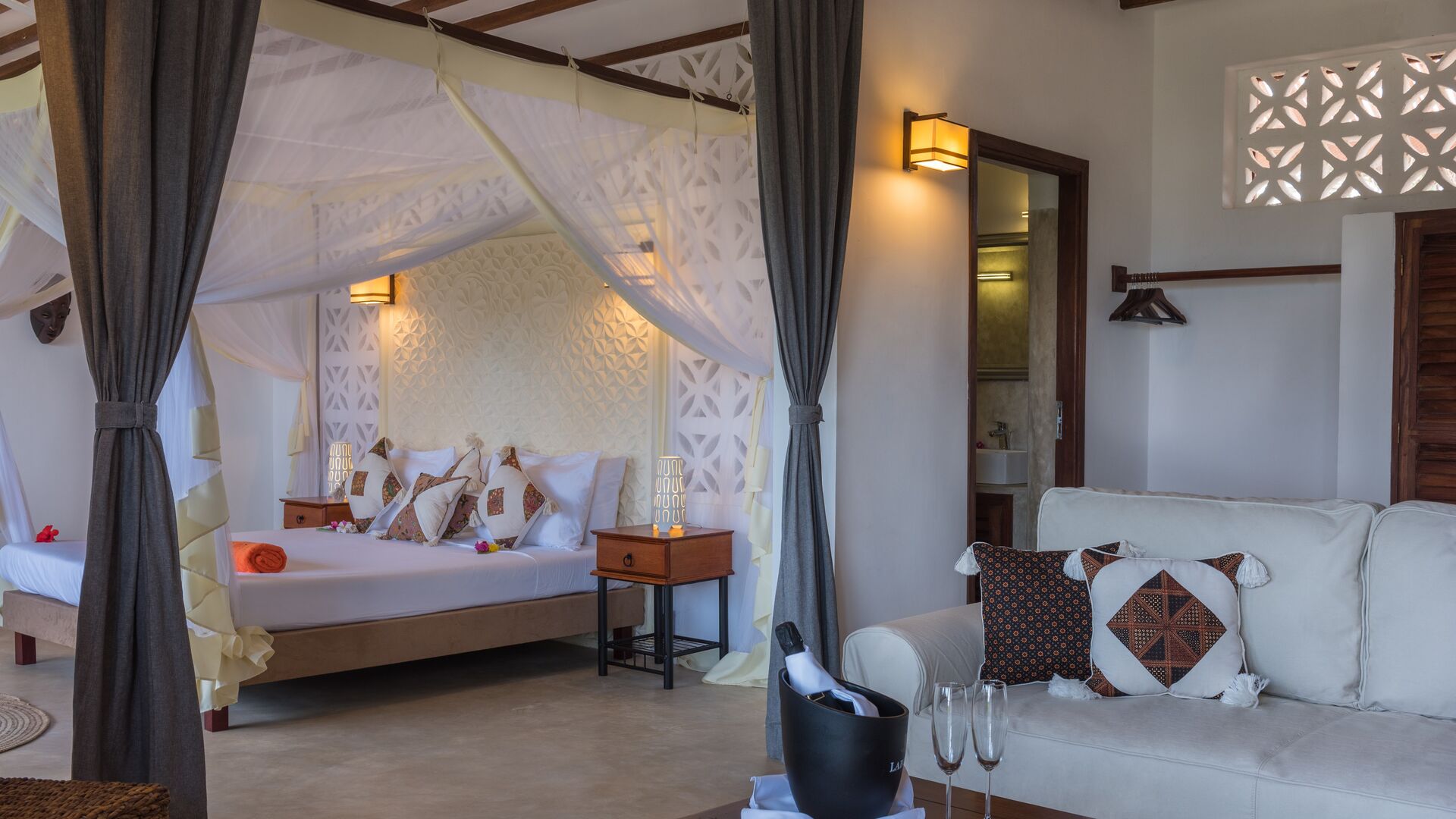 Så er der brudesuiten på 70 kvadratmeter. Det består et soveværelse forbundet med en stor stue, en afslappende stor sofa og stilfuldt bord. Luksus strækker sig til verandaen i dobbelt størrelse, som er et perfekt sted at nyde udsigten over stranden og havet. Den airconditionerede Honeymoon Seaview Suite kan forbindes med det tilstødende værelse for at skabe et luksuriøst rum på mere end 110 kvadratmeter. Med to rummelige badeværelser er det en ægte perle for en familie eller en gruppe på op til syv venner.