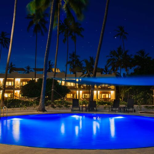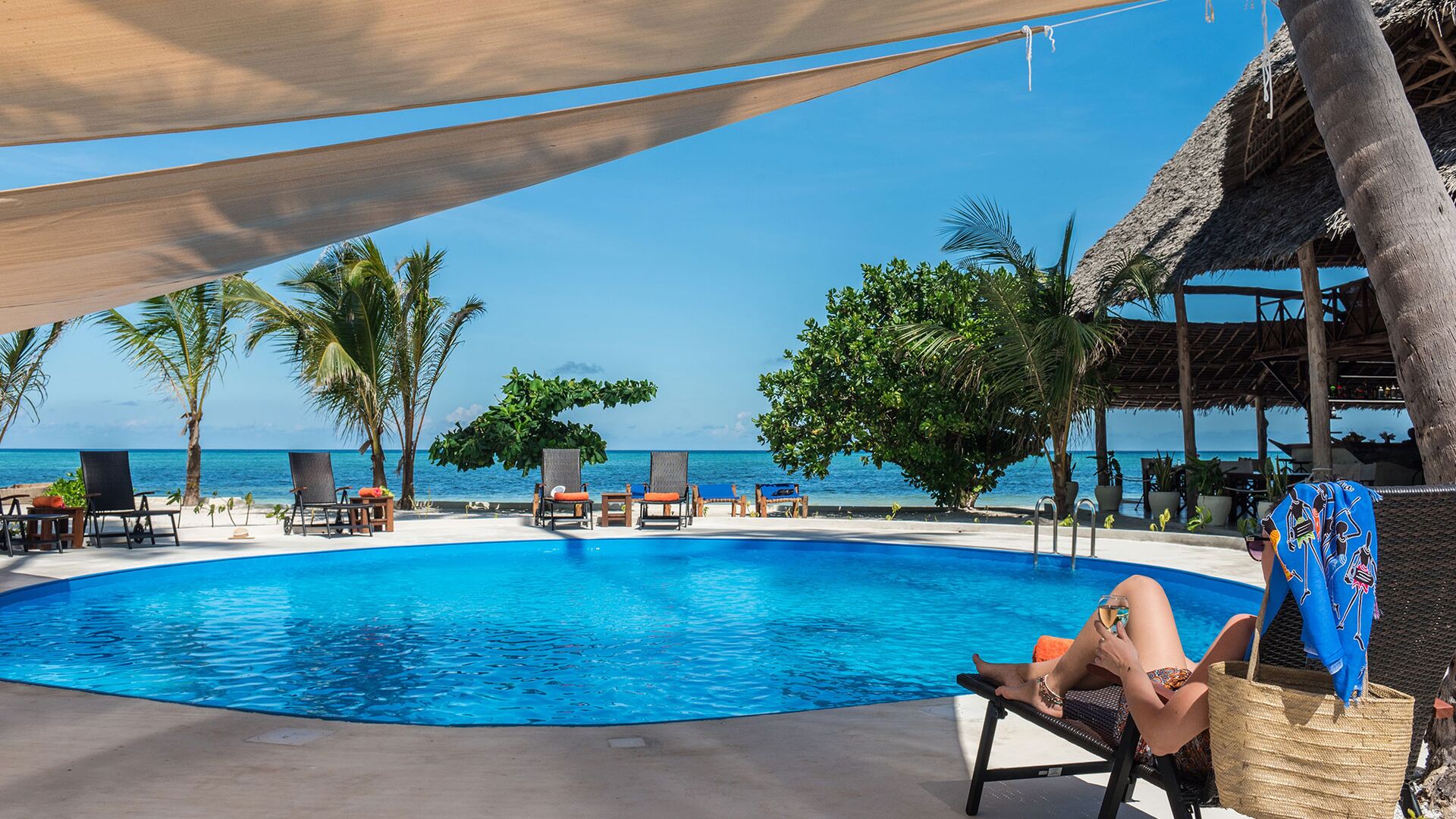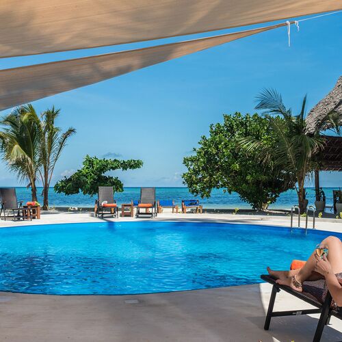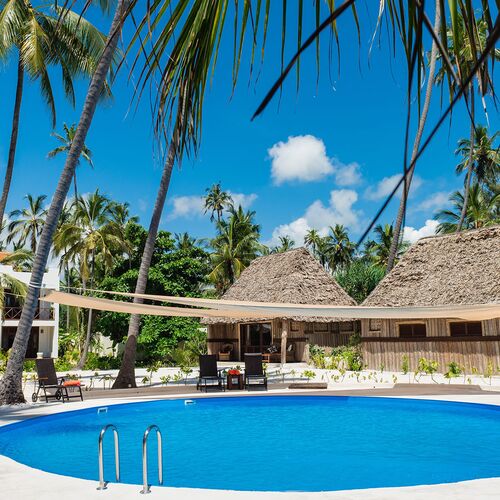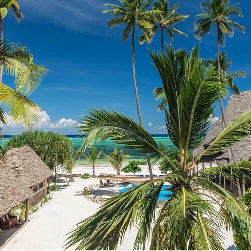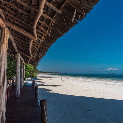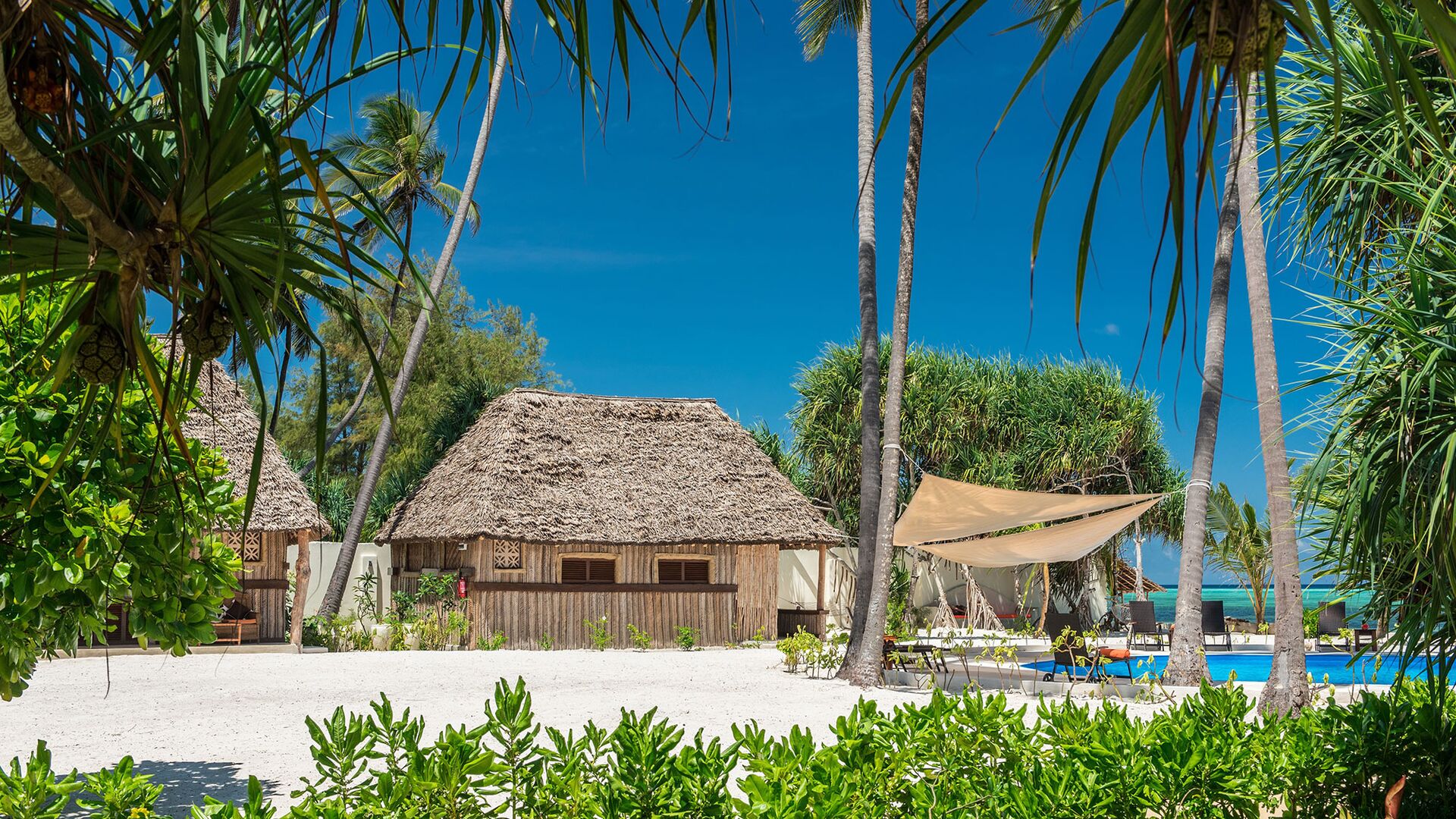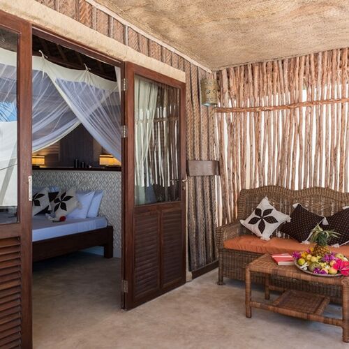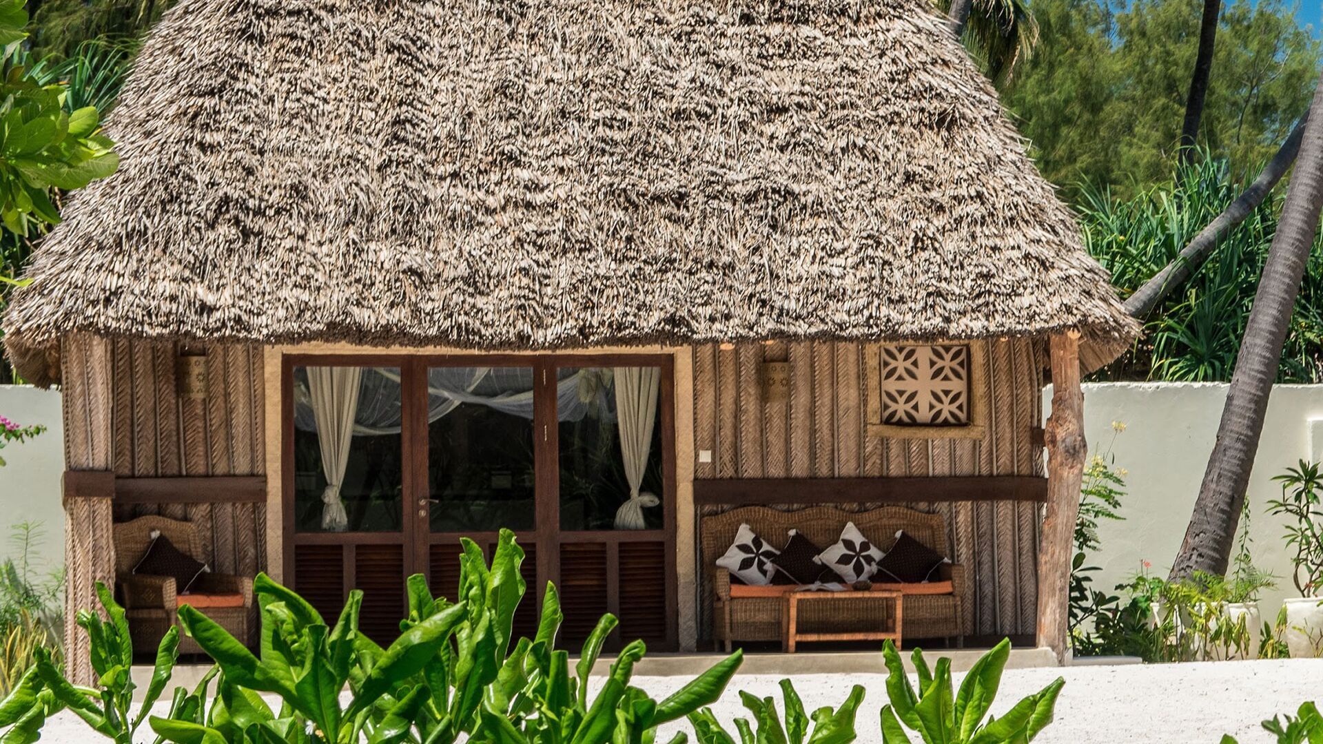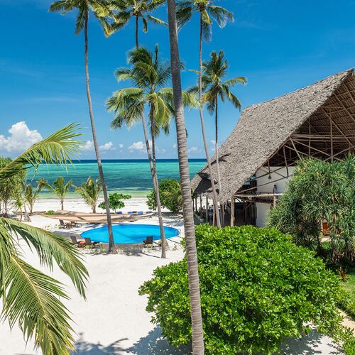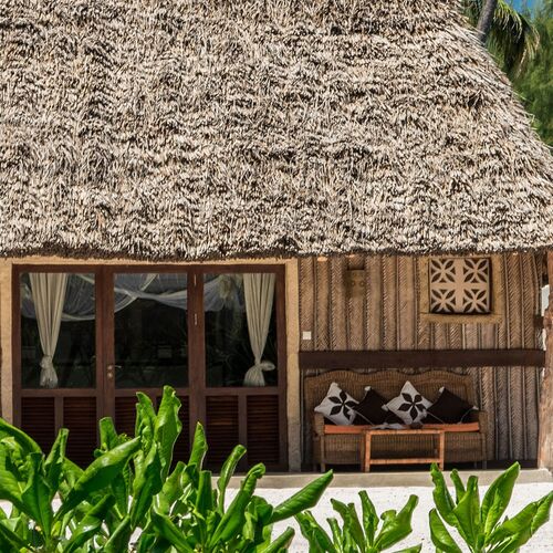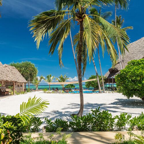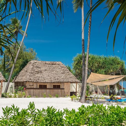 Beliggende ved hvid sandstrand i Matemwe Village på Zanzibars nordøst kyst.