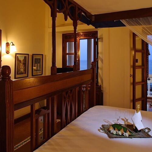 Sea Front Prime Rooms: Sea Front Prime Rooms på Zanzibar Serena Hotel er en ægte perle, præsenteret i traditionel Swahili-stil. Hvert værelse er fyldt med traditionelle nicheområder, smukt udførte tremmekabinetter og farverige kystbomuldstekstiler i kølige blå nuancer. Himmelsengen er overdådigt klædt i myggenet og giver rigelig plads som en generøs king-size seng. Værelset åbner op til en pragtfuld L-formet altan med panoramaudsigt over havet, sit eget udendørs cocktailområde og en dobbelt hængekøje. Det er det perfekte sted at nyde den betagende havudsigt og slappe af i ro og mag.