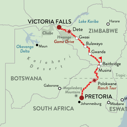 Dette 1400 km eventyr tager sin start fra Rovos Rail Station i Pretoria, Sydafrika. Rejs nord på igennem Warmbaths (Bela Bela), opkaldt efter sine naturlige varme kilder og byen Nylstroom, navngivet efter Nilen af tidlige pionerer der mente at være kommet til Egypten. Passér kanten af The Great Escarpment og kryds Tropic of Capricorn og Limpopo-floden til Beitbridge.