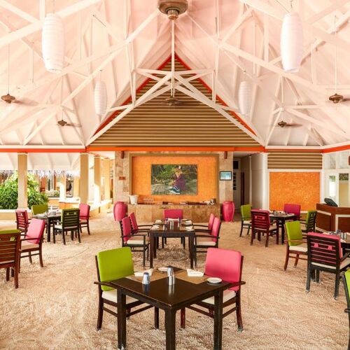 Det 4-stjernede resort tilbyder 6 spisesteder, med mulighed for a la carte og buffet restauranter. Man kan få alt fra sea-food til thai cuisine, indiske specialiteter og pizza on the beach. Øen har flere barer, hvor man kan nyde et let måltid og en kølig drink.