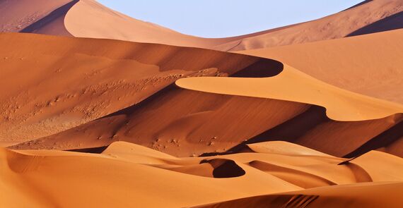 Namibørkenen, betragtet som verdens ældste ørken, strækker sig langs Atlanterhavskysten og byder på spektakulære sandklitter, der skifter farve med dagens gang. Om morgenen indhyller tågen landskabet i et strejf af mystik, mens de høje klitter langs Sossusvlei reflekterer solens første stråler. De vidtstrakte sandklitter formes konstant af vinden og skaber et dynamisk landskab, hvor den konstante forandring er en del af oplevelsen.
