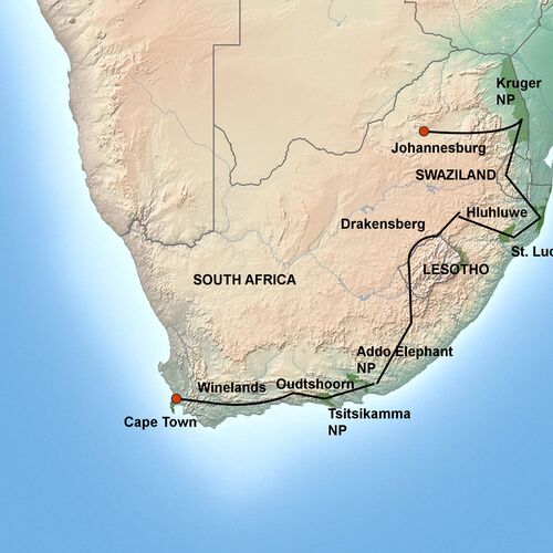 Under det meget omfattende og tre uger lange program på denne lodge-safari, vil du virkeligt få at se, hvorfor Sydafrika kan tillade sig at markedsføre sig under slogannet ”Hele verden i et land”. Turen byder også på et par dage i hvert af de små spændende kongeriger, Swaziland og Lesotho.