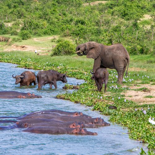Vi vil se antiloper, særligt den lokalt almindelige Uganda kob og vandbukke og her er en god bestand af løver, leoparder, hyæner og gigantskovsvin, som er vildtsvin. Vi vil også kunne opleve elefanter, særligt på sydsiden af Kazinga kanalen, som vi senere skal ud og sejle på.