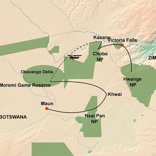Tag på en uforglemmelig safarirejse til Botswana og Zimbabwe, som starter i byen Maun og slutter ved det majestætiske Victoria Falls. Turen tager dig gennem nogle af Botswanas og Zimbabwes mest storslåede naturreservater.