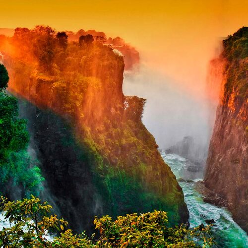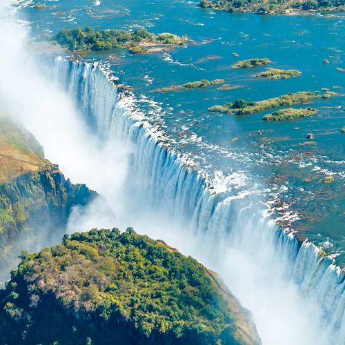 Victoria Falls er ikke alene Zimbabwes største attraktion, men også en af kontinentets mest besøgte naturdestinationer. Afrikas største og verdens næststørste vandfald er simpelthen dybt imponerende og dets dimensioner næsten ufattelige: Det er lidt over 1,7 km bredt, falder 108 meter på det højeste sted, og i regntiden kan der strømme mere end en halv million tons vand ud over kanten i minuttet. Den lille regnskov langs vandfaldene trives netop på grund af de konstant drivende tåger fra vandfaldet, og her kan f.eks. ses en del bavianer, marekatte og store næsehornsfugle.